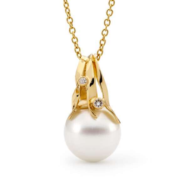 Canal Rocks Pearl Pendant featuring a white South Sea pearl and diamonds set in 18k yellow gold