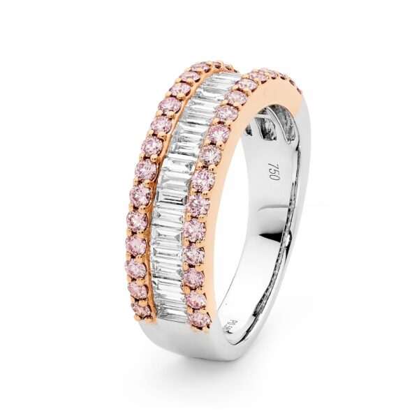 This 18ct white and rose gold triple diamond row ring is a striking piece that will add a statement to every look. The wide band features channel set white (23=0.66ct F/VS) baguette cut diamonds with round brilliant cut Argyle pink diamonds (34 = 0.58ct 7P SI) claw set on the outside edges.