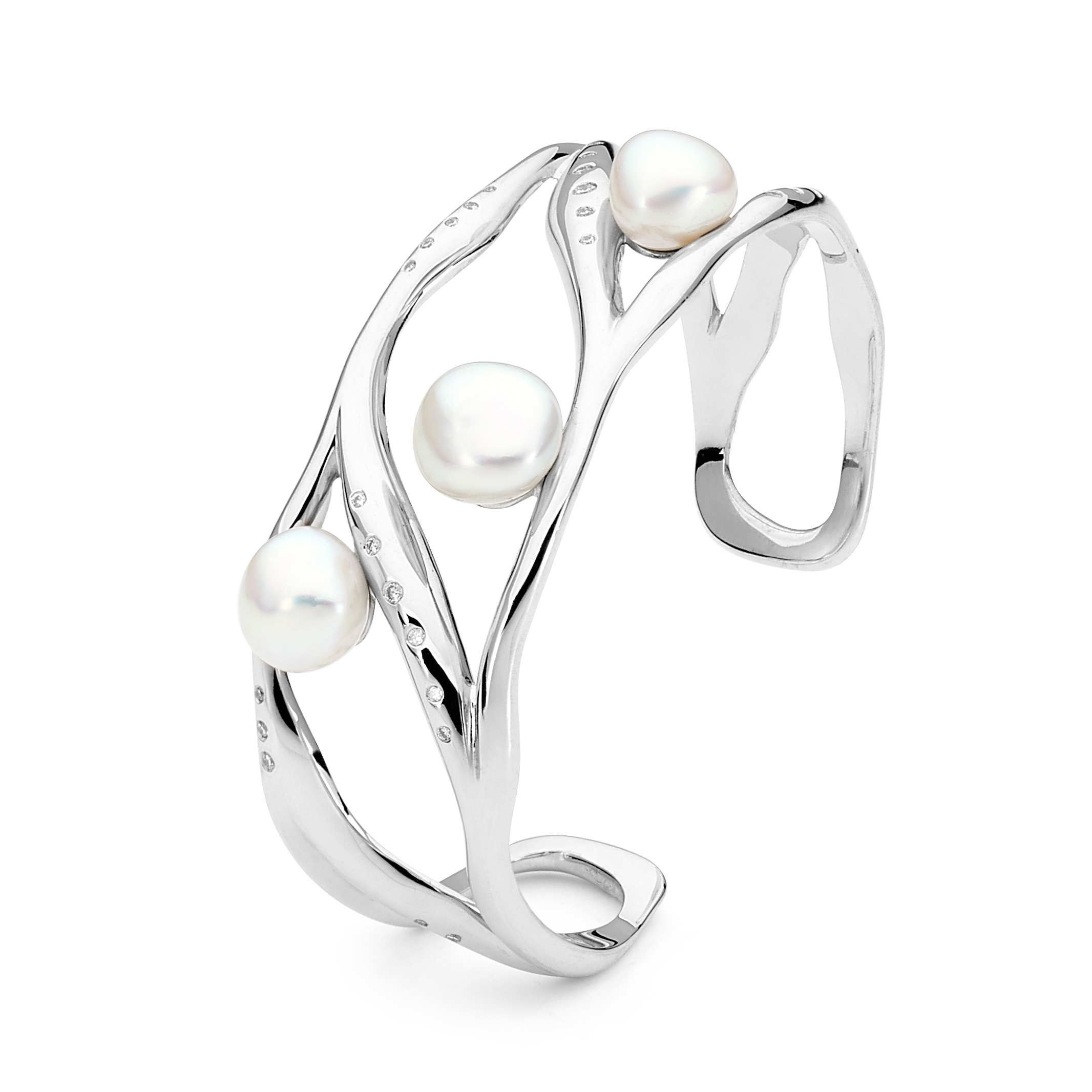This beautiful cuff is crafted in 18ct white gold and features 3x Australian South Sea keshi pearls (10.4mm to 11.8mm) and 27=0.37ct G/SI diamonds.