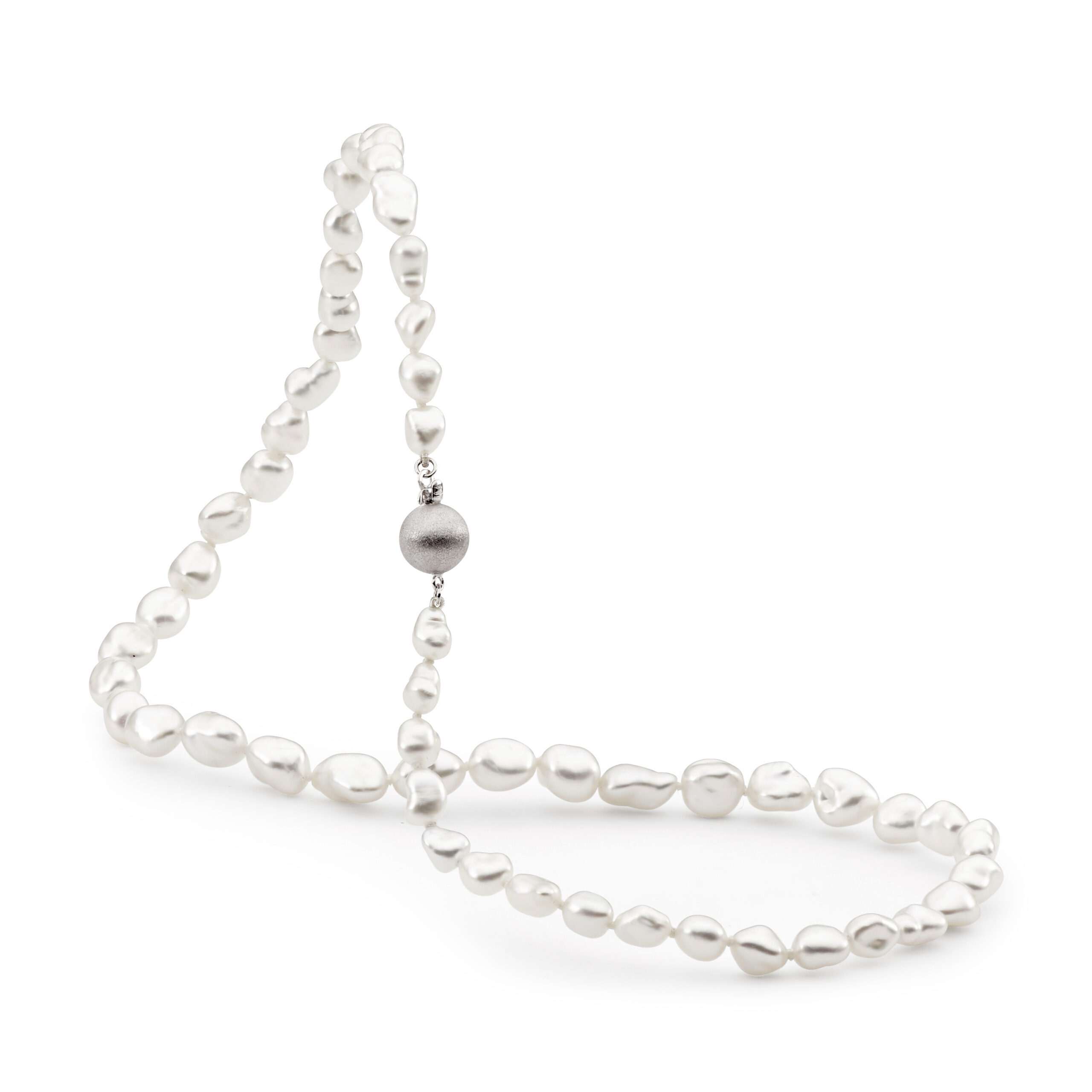 This pearl strand features 53x white South Sea keshi pearls ranging in size from 5-7mm and is complete with a 9mm 18ct white gold frosted ball clasp.