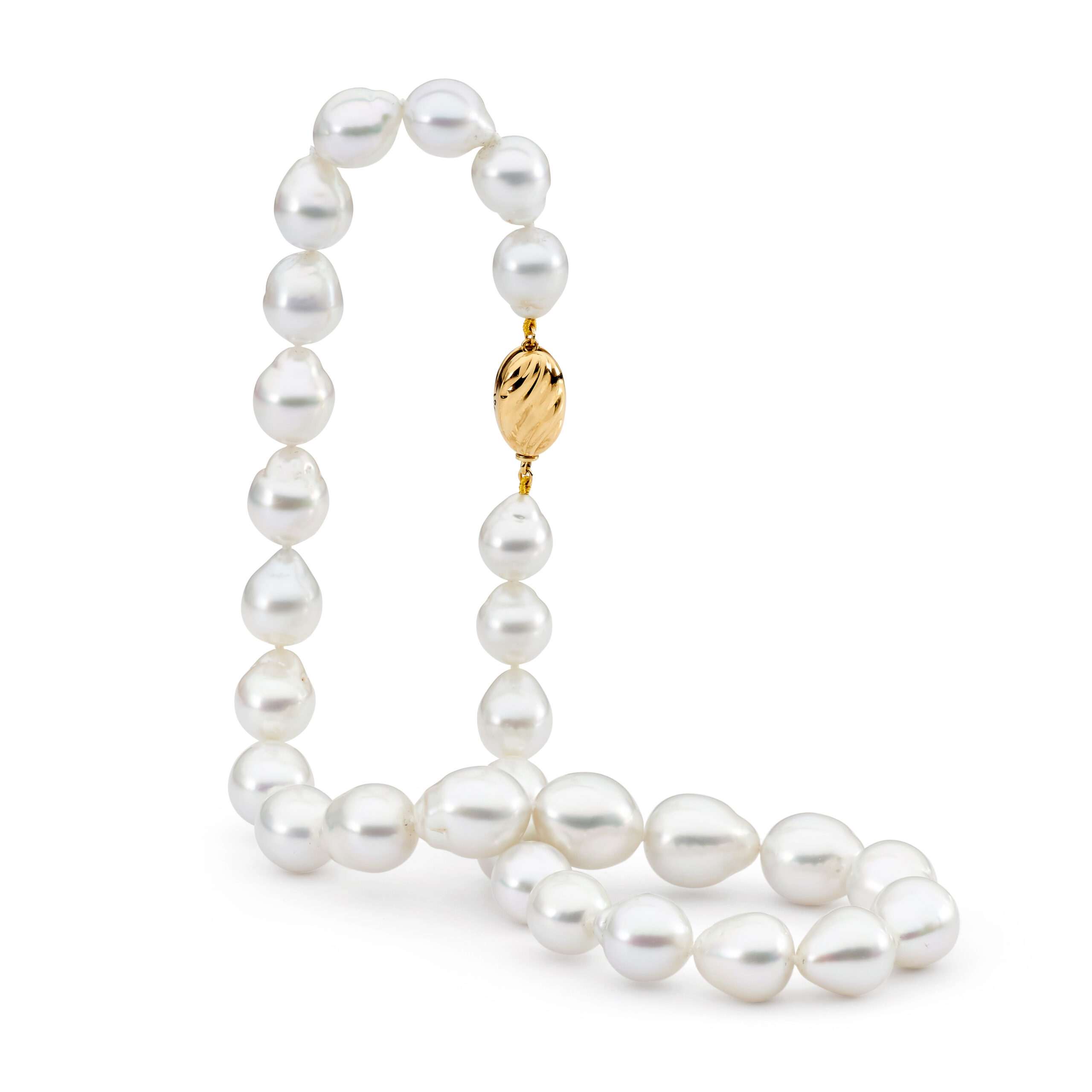 This pearl strand features 29x semi baroque Australian South Sea cultured pearls (11.1-13.9mm) and is complete with an 18ct yellow gold Alligator clasp.