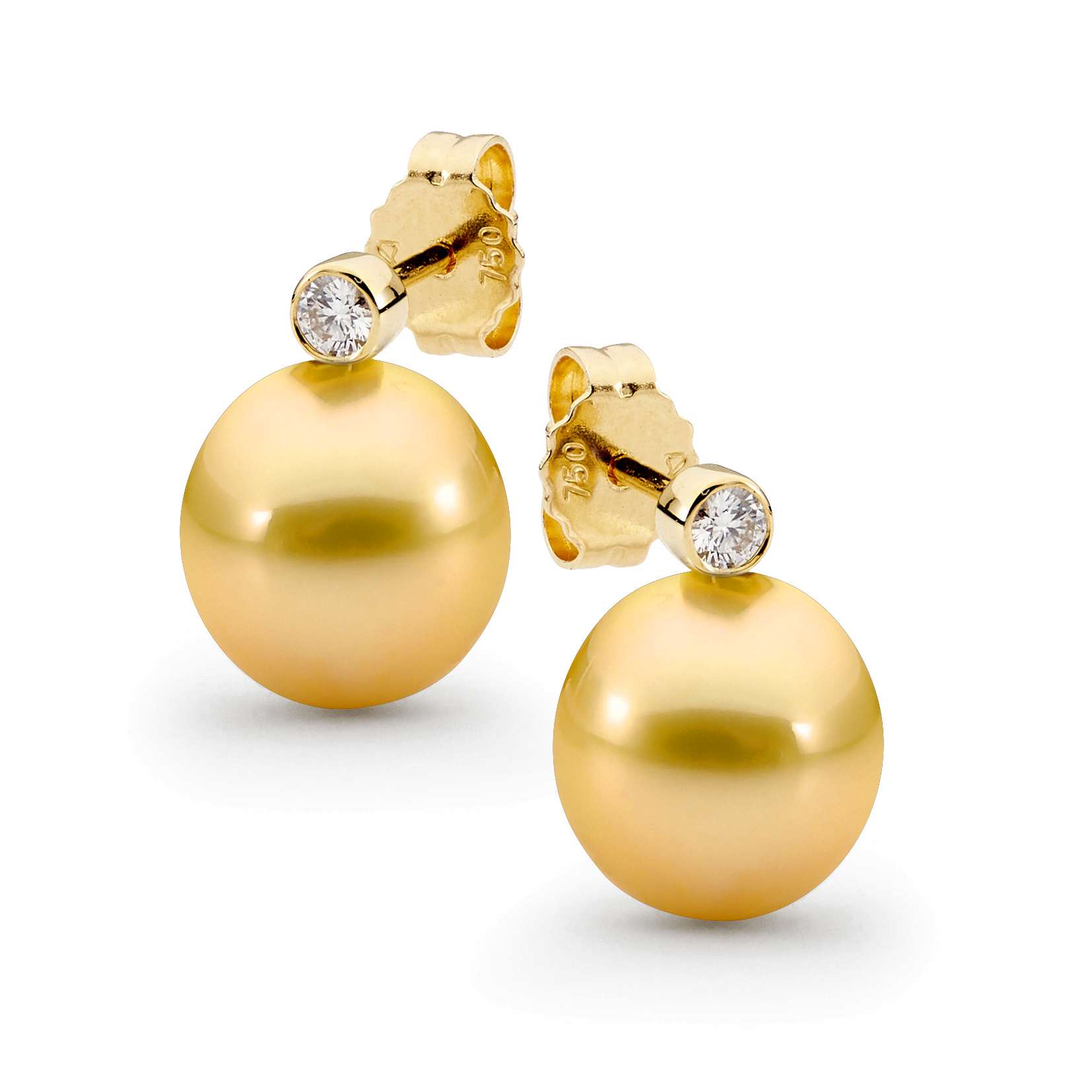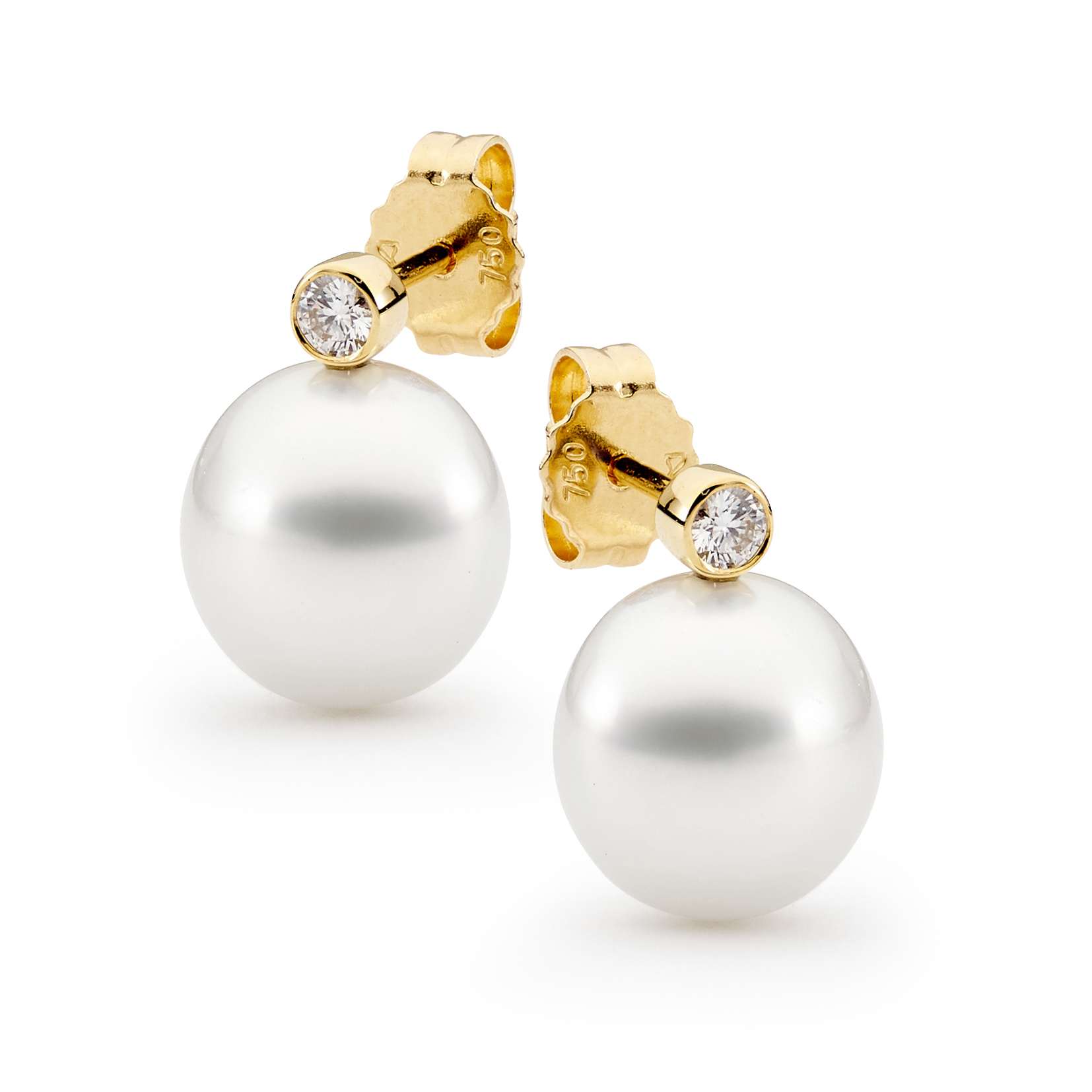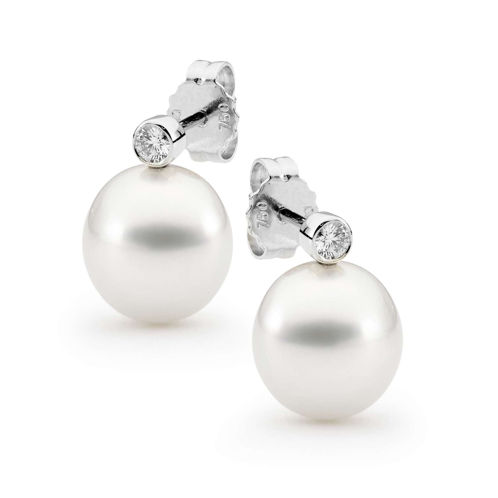 These stunning pearl earrings are set in 18ct yellow or white gold and feature a lustrous pair of 9-10mm oval/drop South Sea cultured pearls and 2=0.10ct G/SI diamonds.