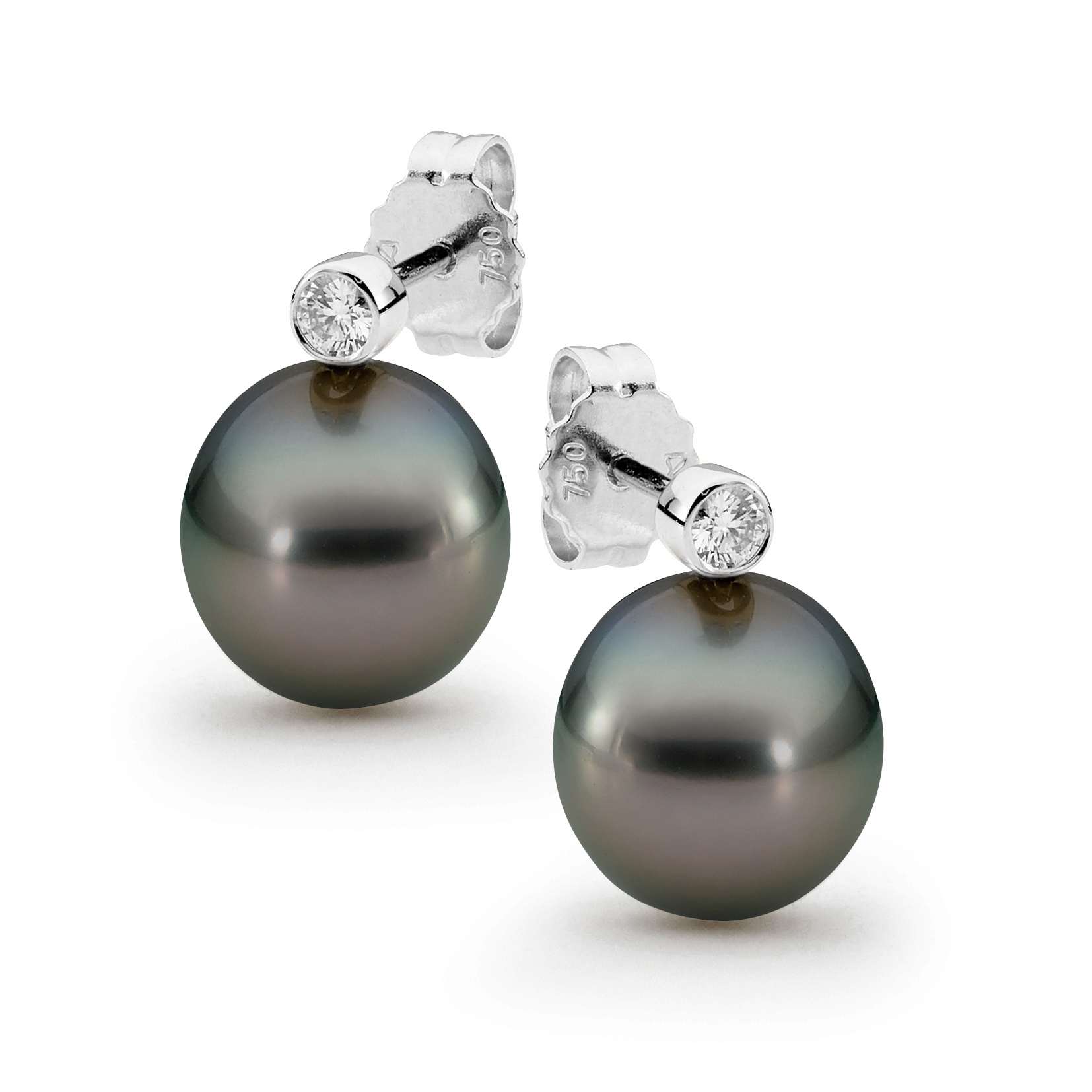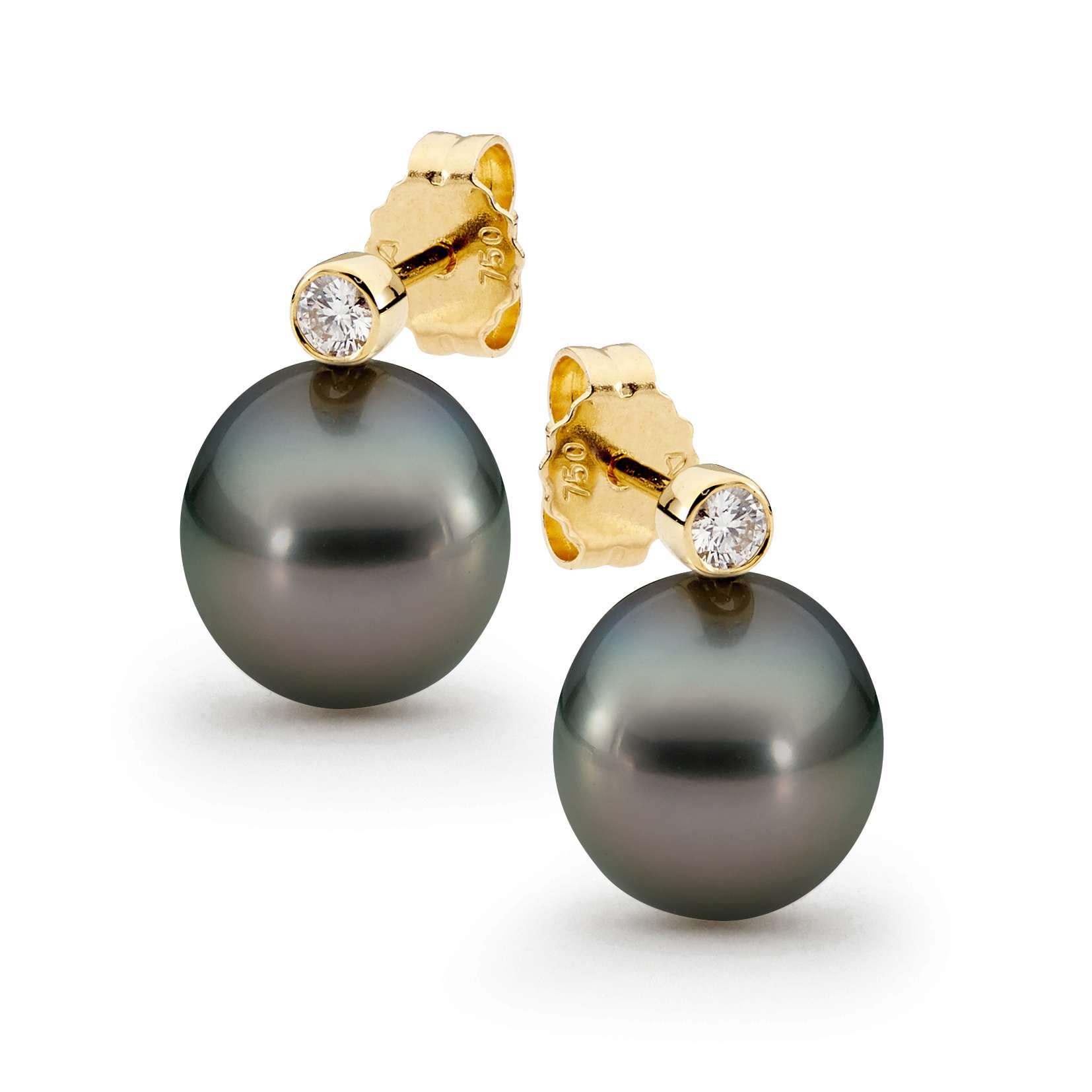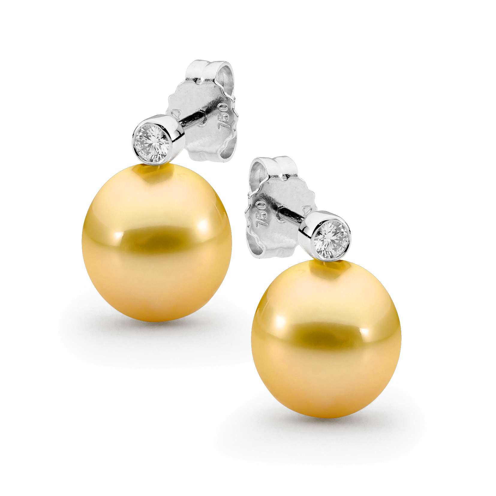 These stunning pearl earrings are set in 18ct yellow or white gold and feature a lustrous pair of 9-10mm oval/drop South Sea cultured pearls and 2=0.10ct G/SI diamonds.