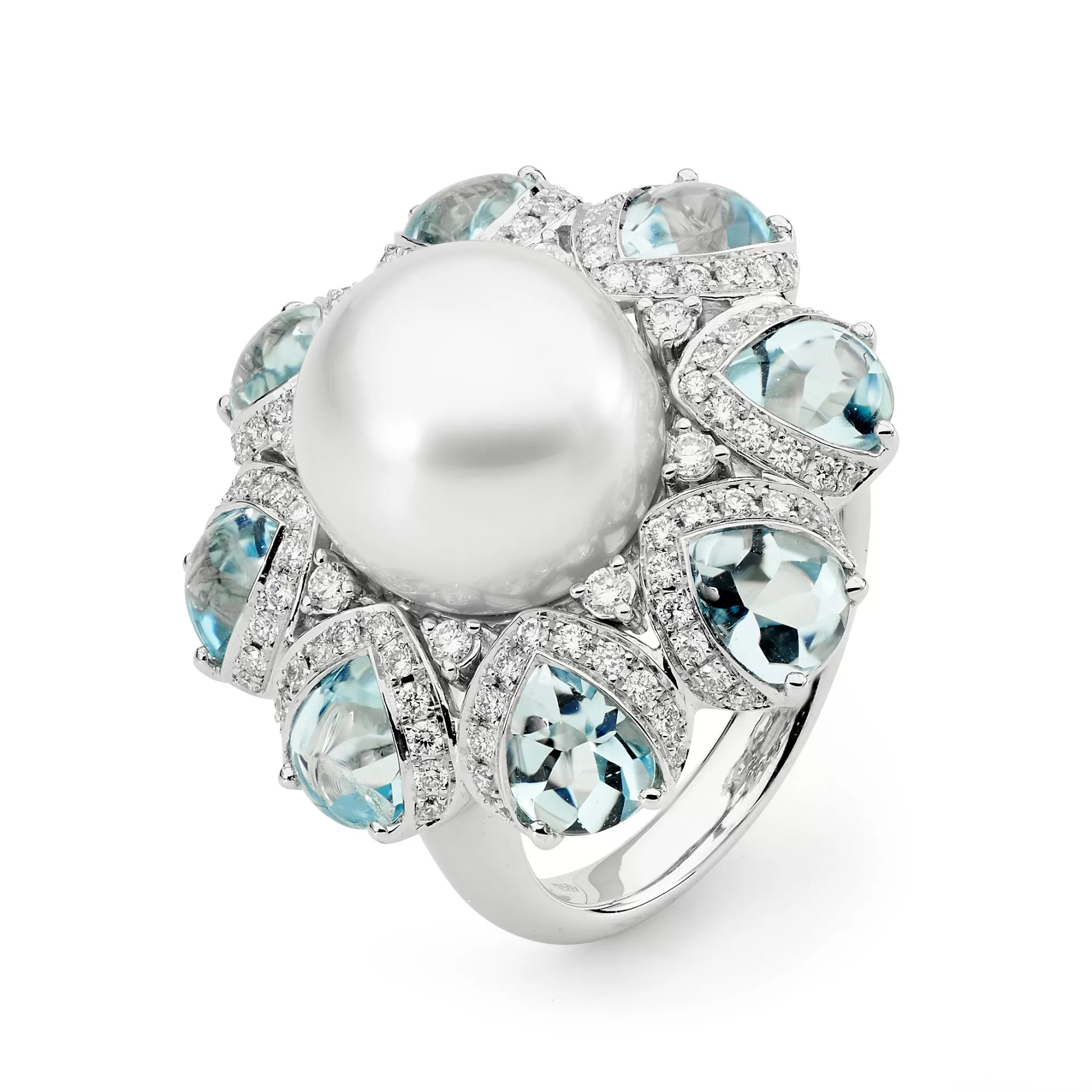 Crafted in 18ct white gold, this beautiful ring features a lustrous 12.5mm Australian South Sea cultured button pearl, 8=5.91ct blue topaz and 96=0.63ct G/SI white diamonds.
