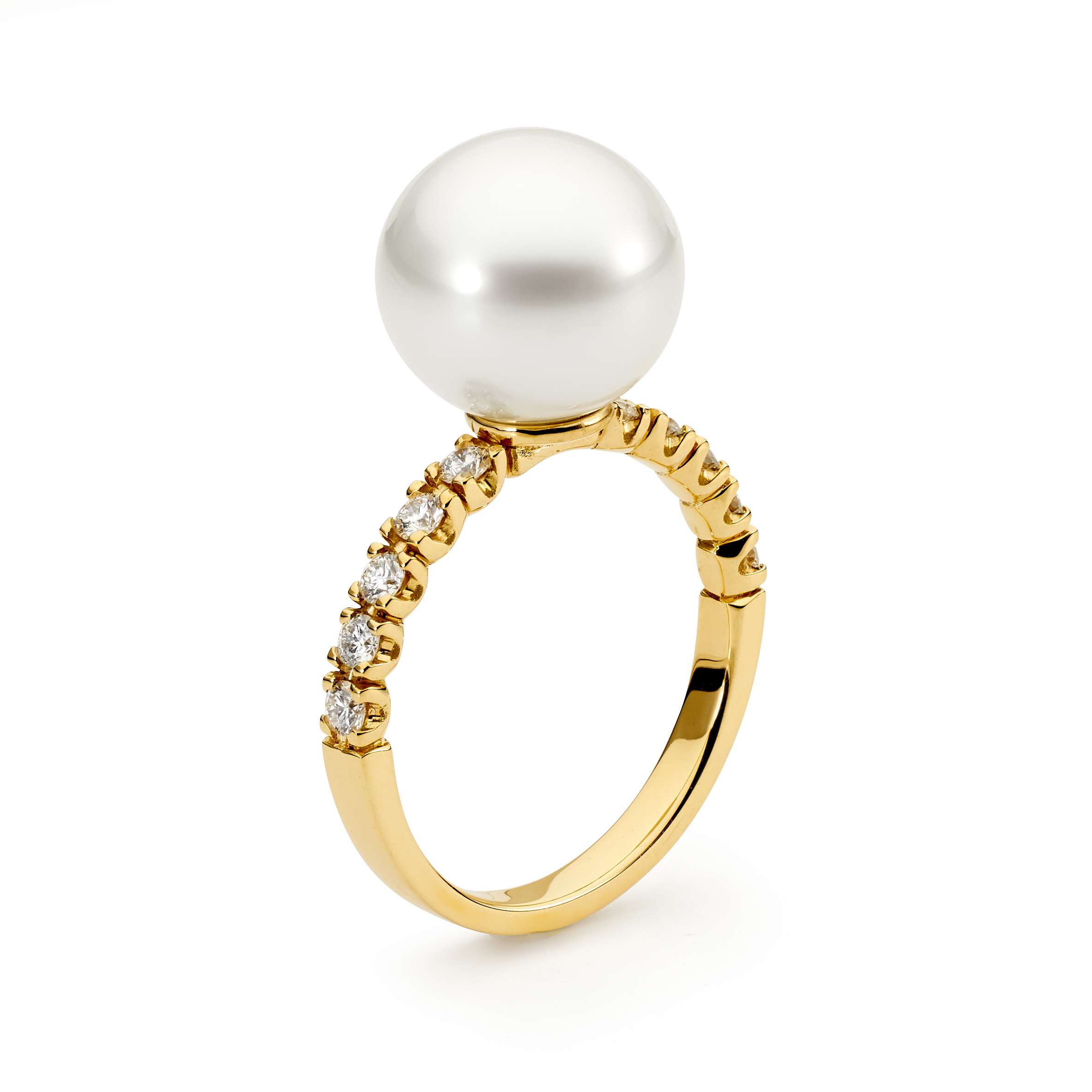 This beautiful pearl ring has been crafted in 18ct yellow gold and features a lustrous 11-12mm Australian South Sea cultured button pearl and 10x 0.035ct G/SI round brilliant cut diamonds.