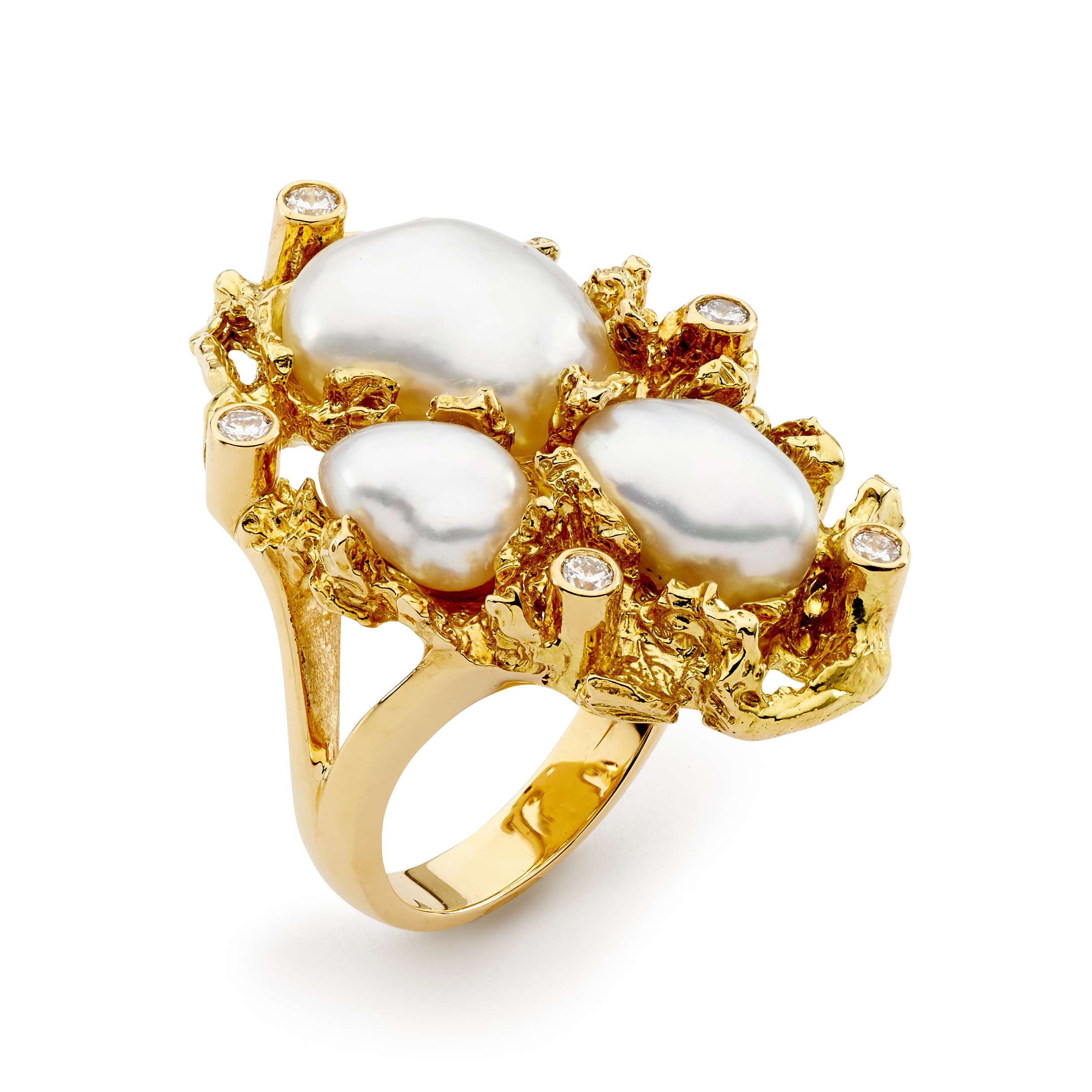 This ring has been handcrafted in 18ct yellow gold and features 3x Australian South Sea keshi pearls (8.1-13mm) and 5x 0.06ct G/SI white diamonds.