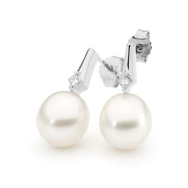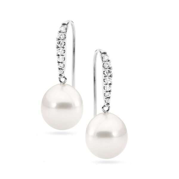 These dazzling detachable huggie earrings are set in 18ct gold and feature 14=0.14ct G/SI claw set white diamonds and a pair of lustrous 10-11mm oval drop South Sea pearls. Available in 18ct white or yellow