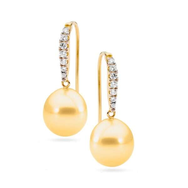 These dazzling detachable huggie earrings are set in 18ct gold and feature 14=0.14ct G/SI claw set white diamonds and a pair of lustrous 10-11mm oval drop South Sea pearls.