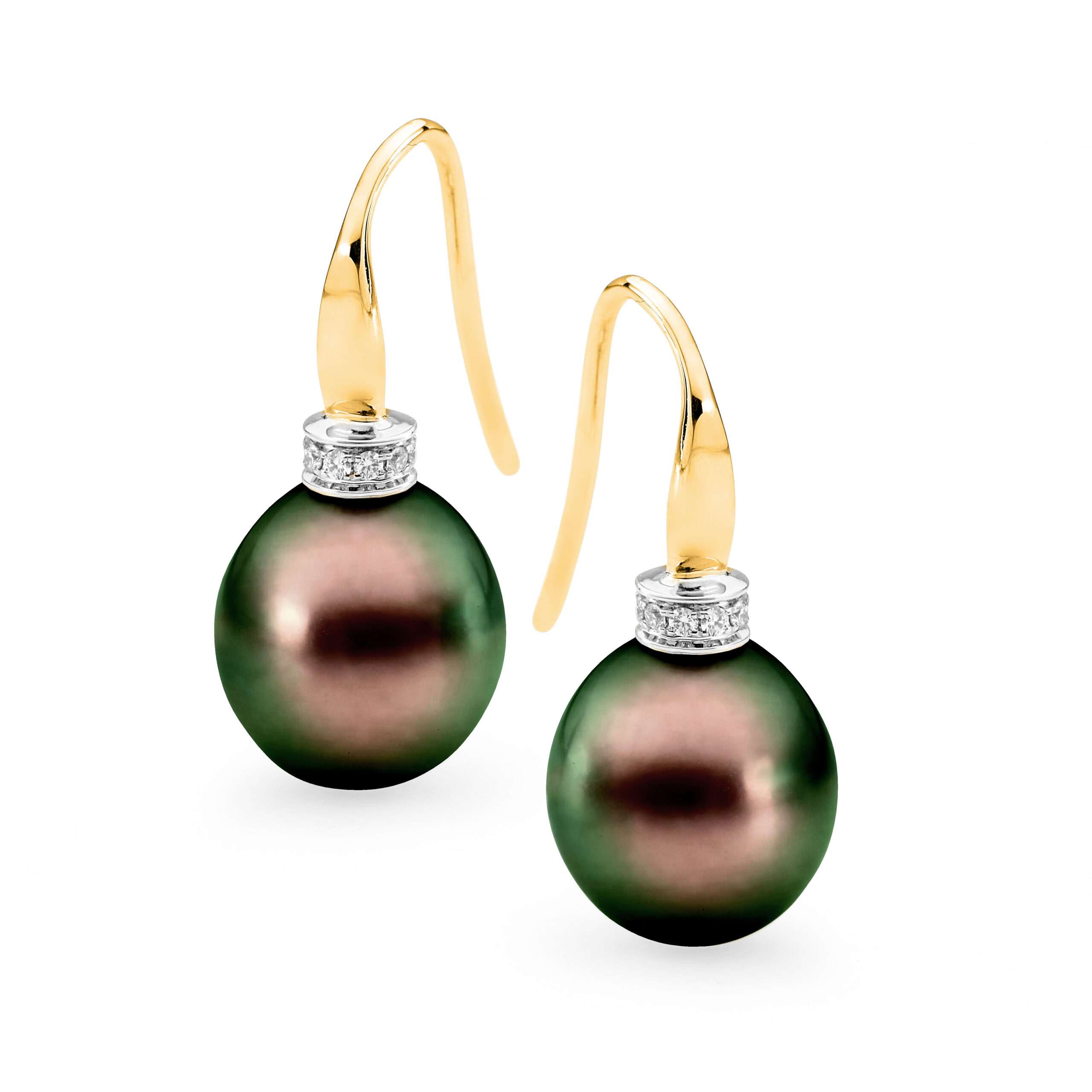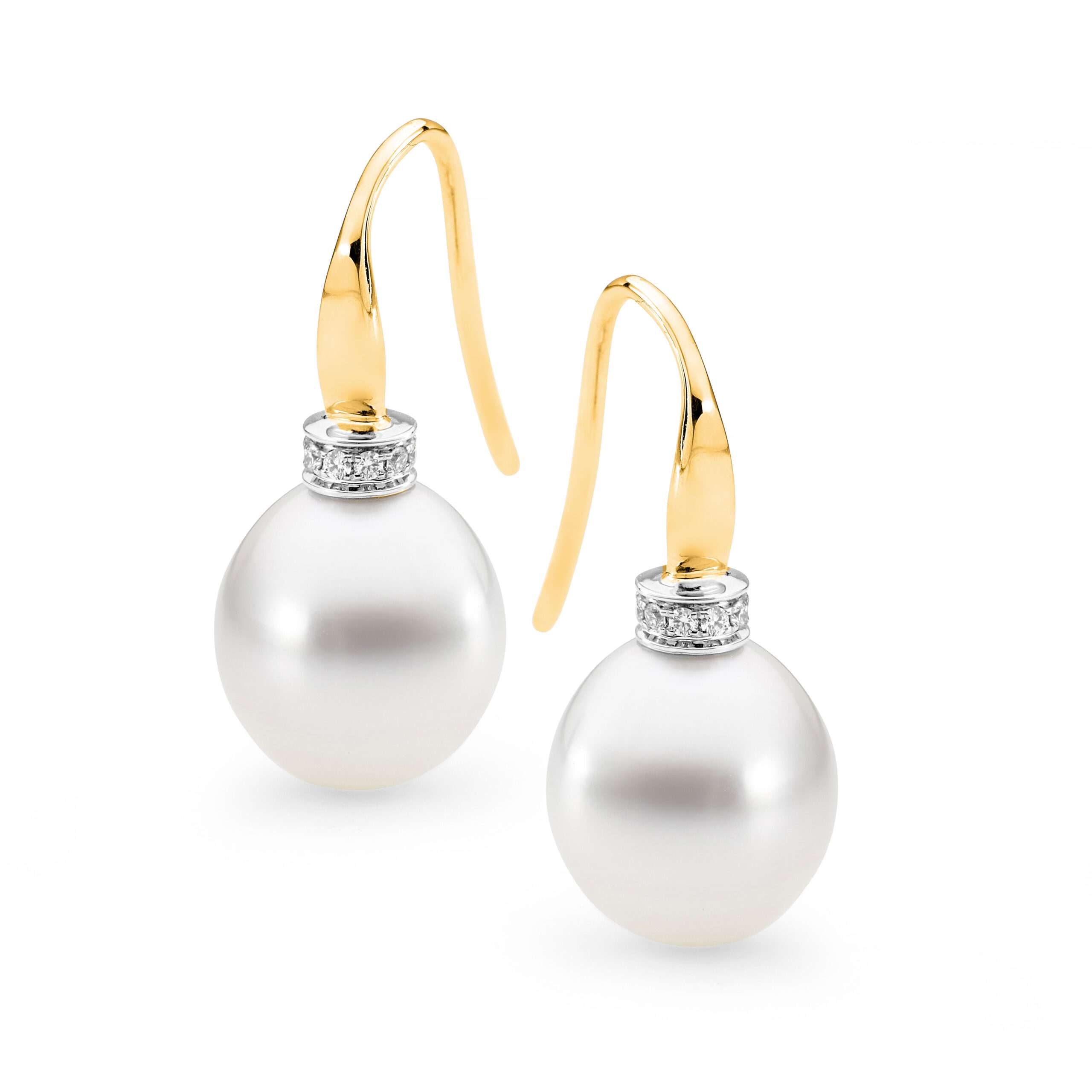 These timeless French hook earrings are crafted in 18ct yellow or white gold and feature 20=0.10ct round brilliant diamonds which perfectly compliment a pair of 10-11mm oval/drop South Sea cultured pearls.