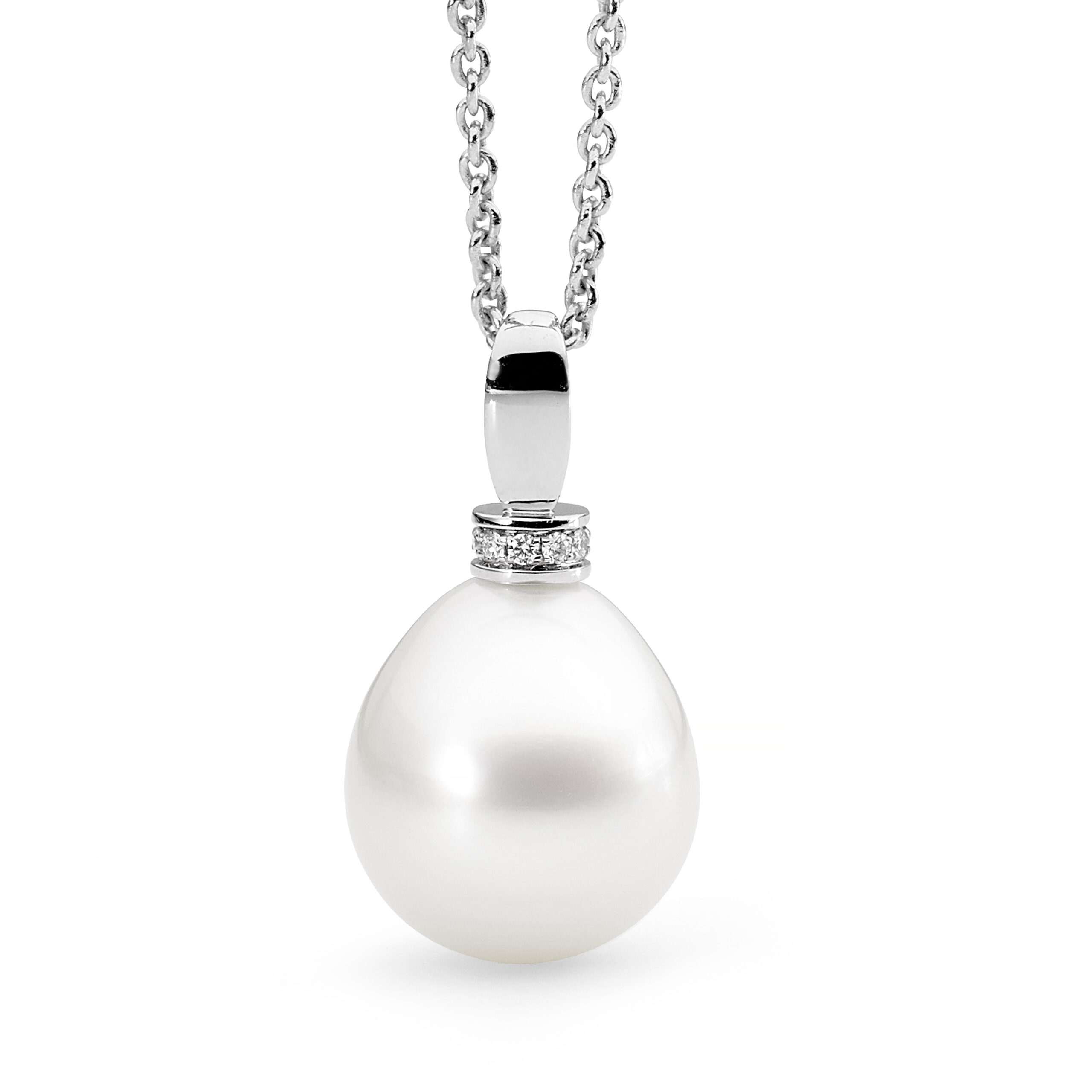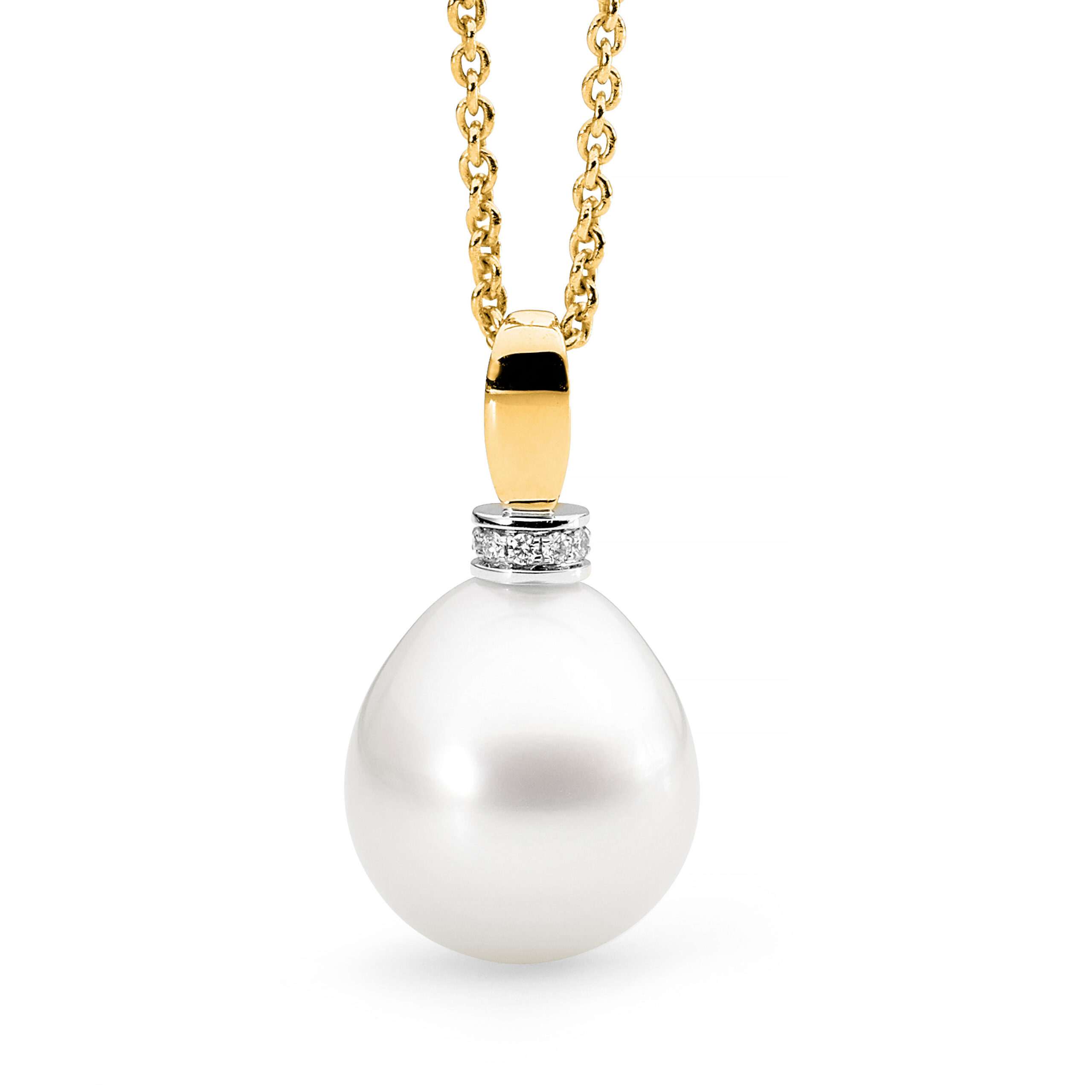 This subtle, yet elegant pendant is crafted in 18ct gold and features 10=0.05ct round brilliant diamonds and a lustrous 12-13mm oval/drop pearl.