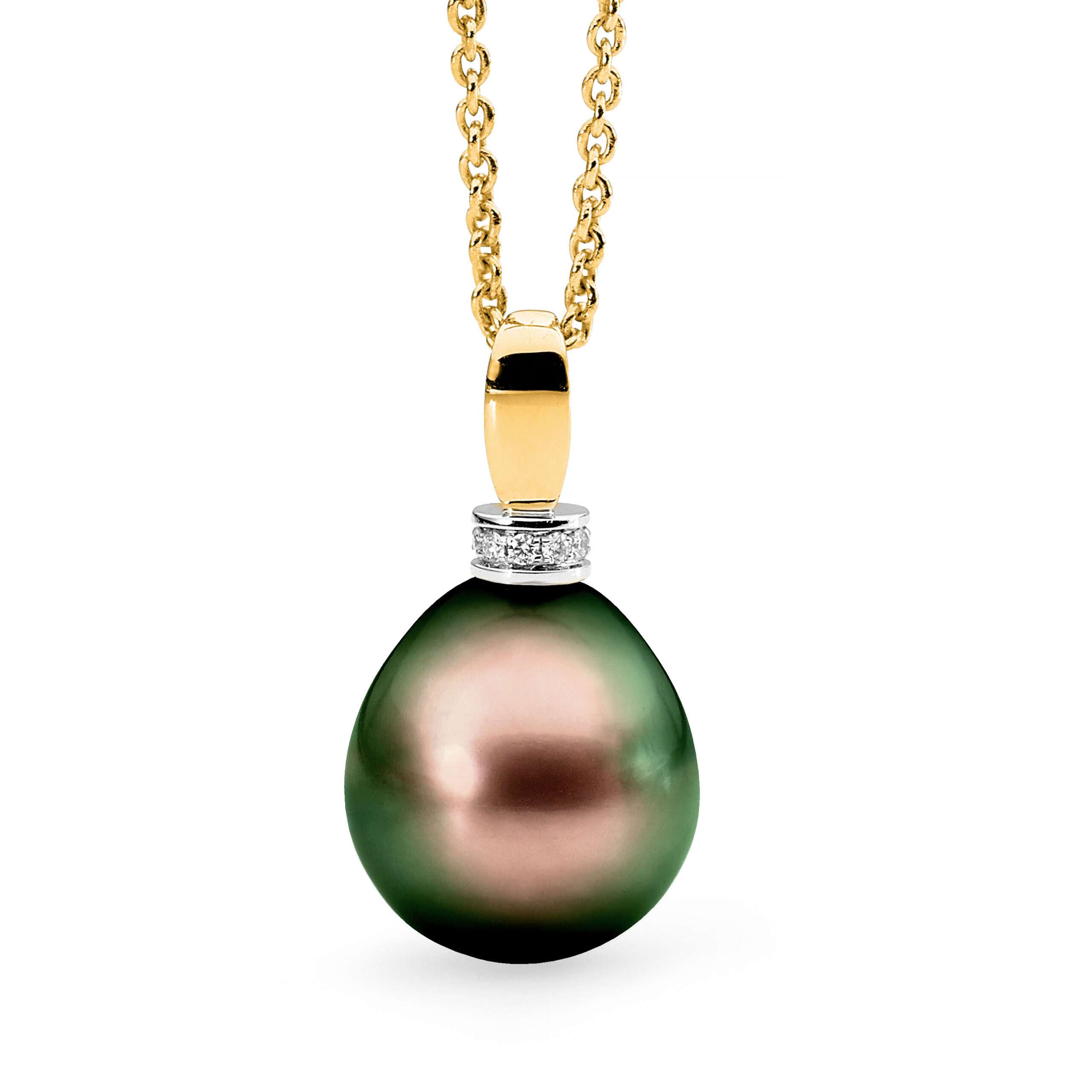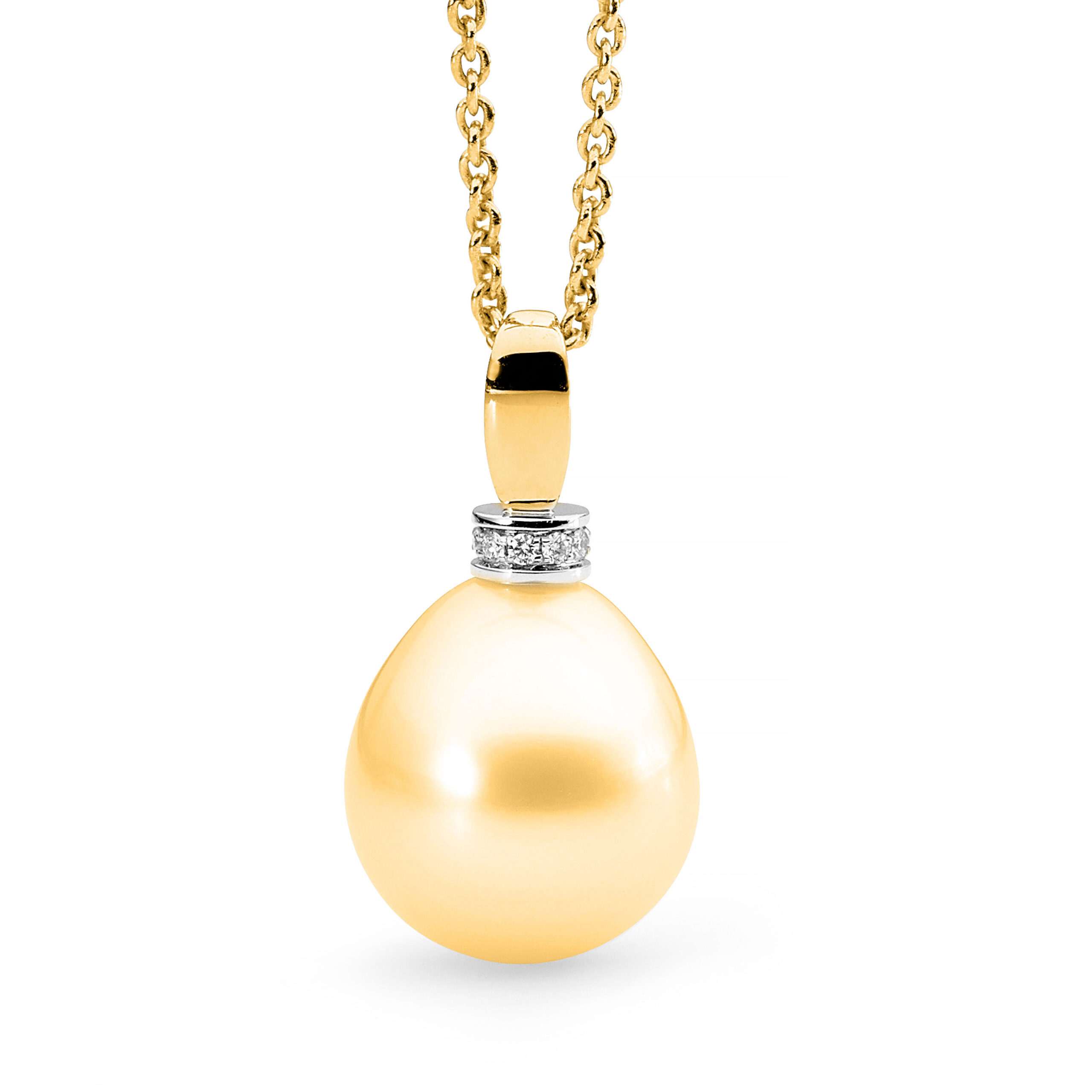 This subtle, yet elegant pendant is crafted in 18ct gold and features 10=0.05ct round brilliant diamonds and a lustrous 12-13mm oval/drop pearl. Available in 18ct yellow or white gold, with three pearl colour variations. Please