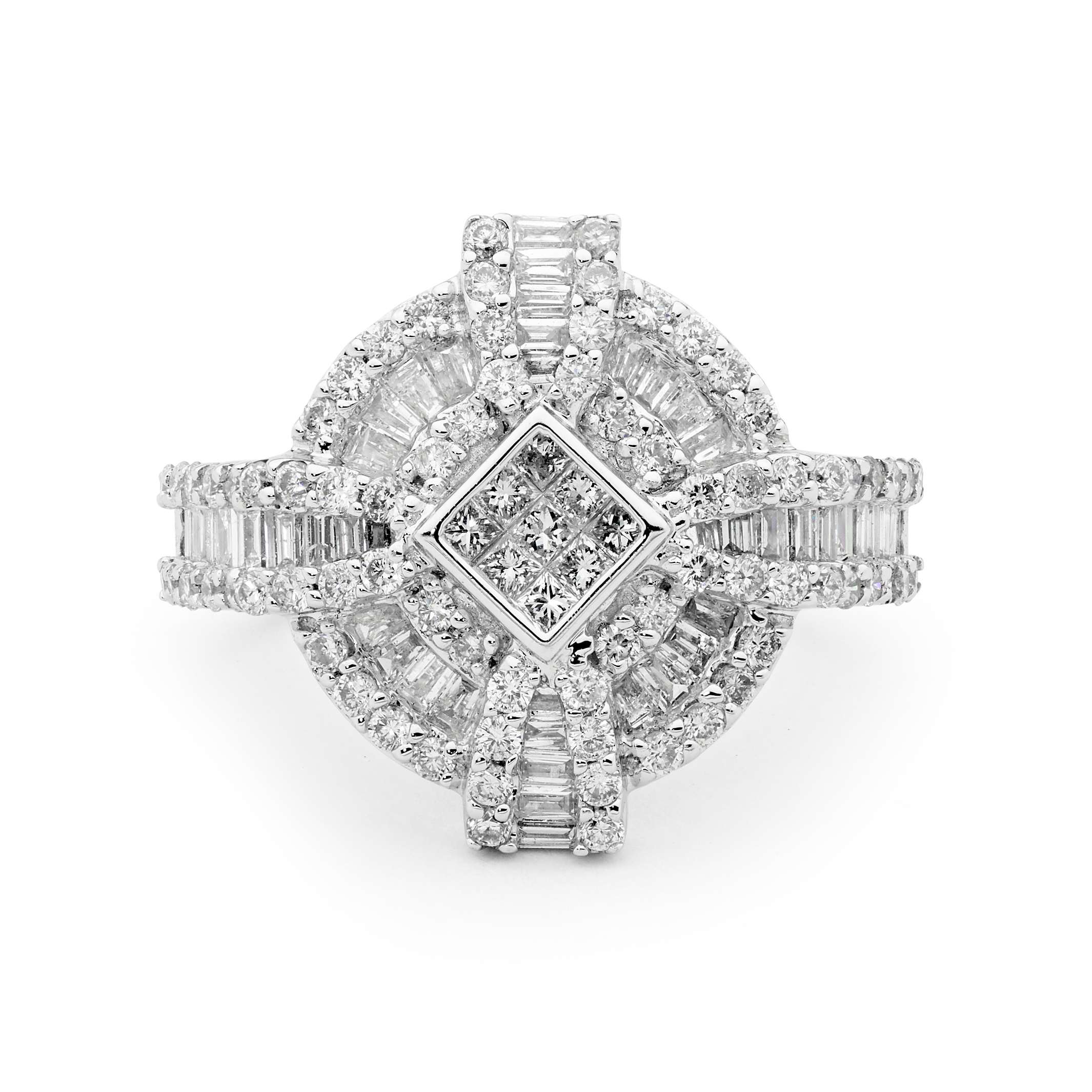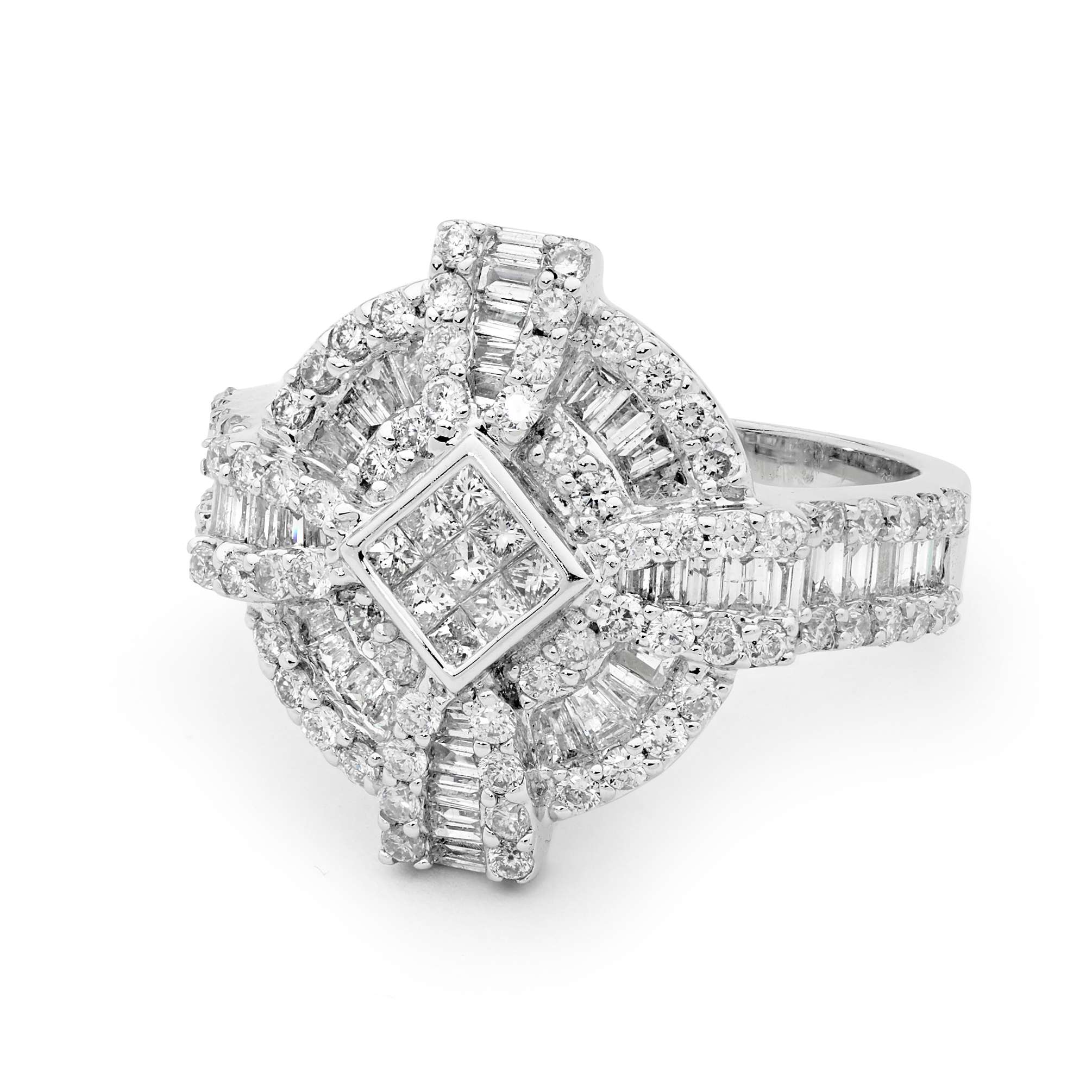 This breath-taking diamond ring is crafted in 18ct white gold and features 9=0.19ct princess cut, 76=0.70ct round brilliant cut, and 50=0.77ct baguette cut G/VS-SI diamonds.