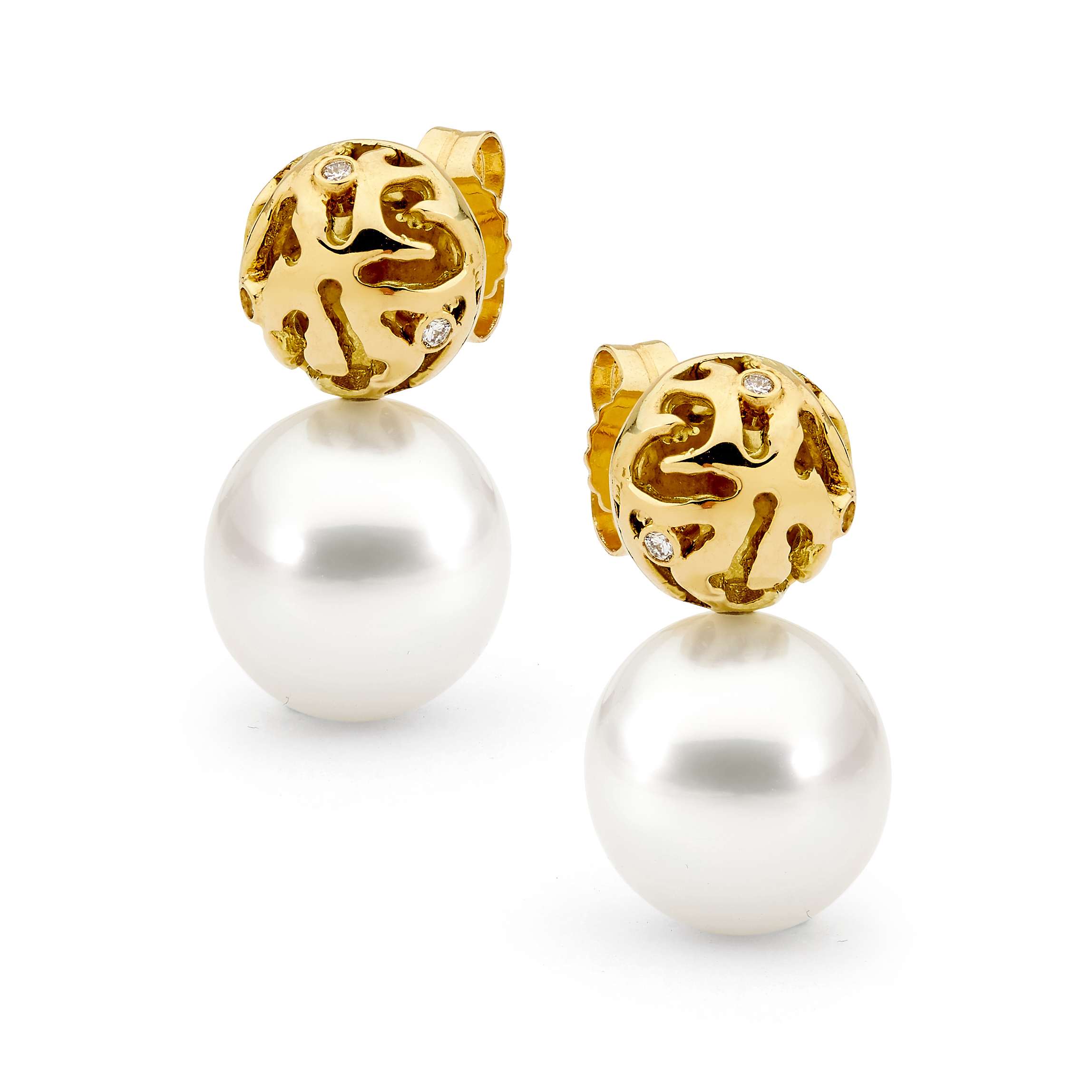 Handcrafted in 18ct yellow gold, the Kimberley Magic Pearl Stud Earrings feature a lustrous pair of 12-13mm oval/drop Australian South Sea cultured pearls and include 6=0.09ct G/SI round brilliant cut diamonds.