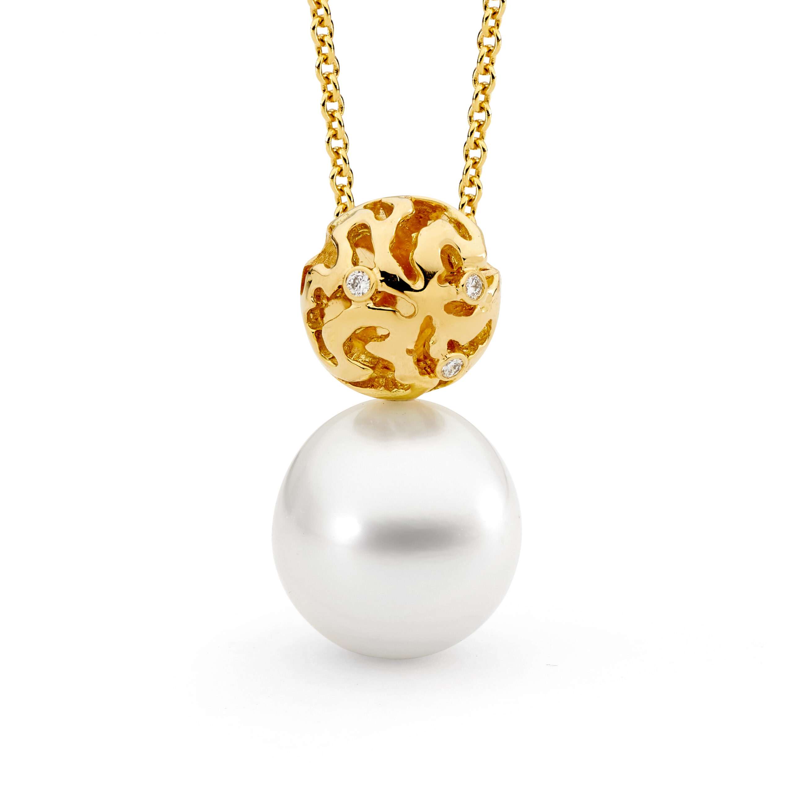This stunning pearl pendant has been handcrafted in 18ct yellow gold and features a lustrous 13-14mm Australian South Sea oval/drop cultured pearl and includes 3=0.045ct G/SI round brilliant cut diamonds.