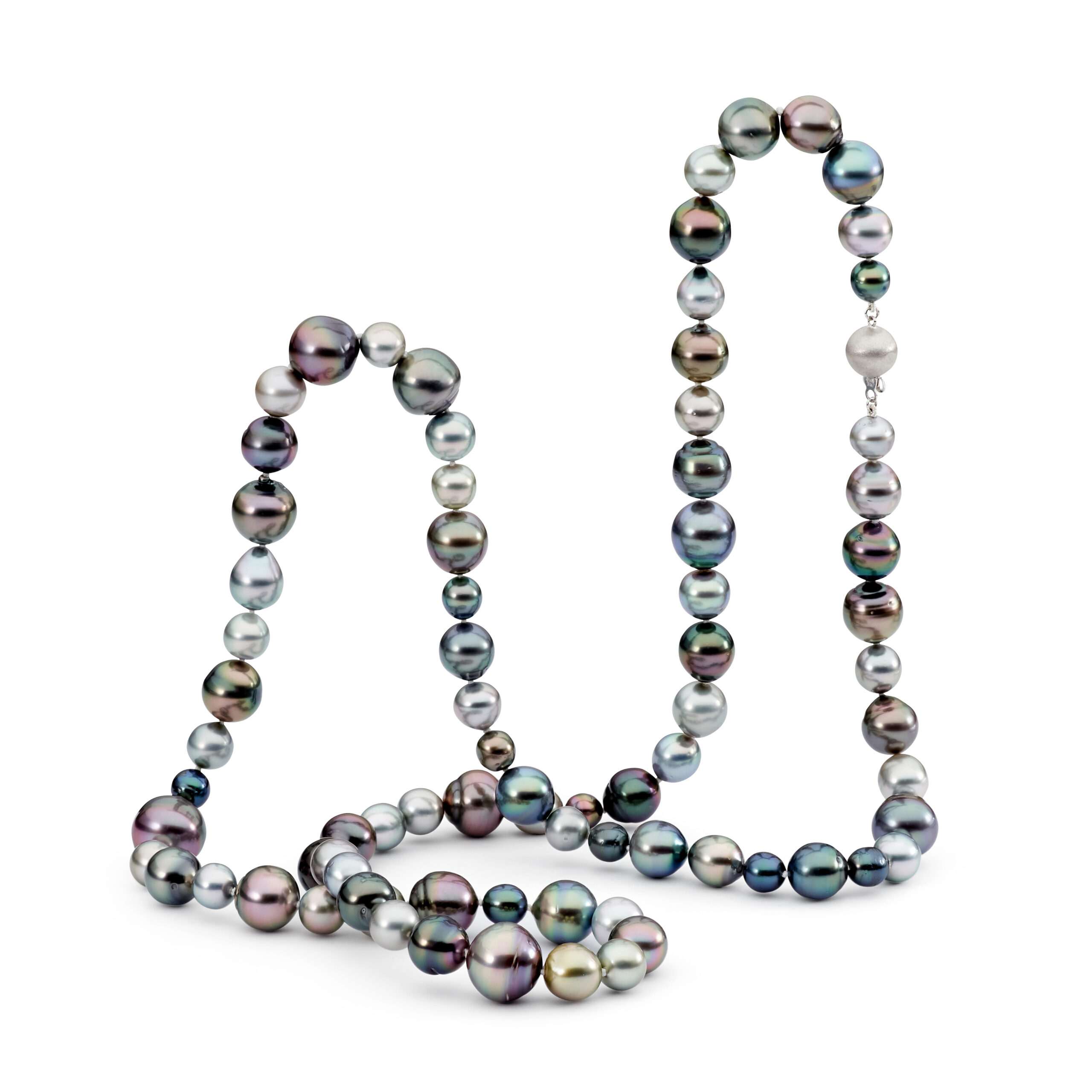 This beautiful pearl strand features 80x black & grey Tahitian South Sea oval/circle pearls (7.8mm-14.75).