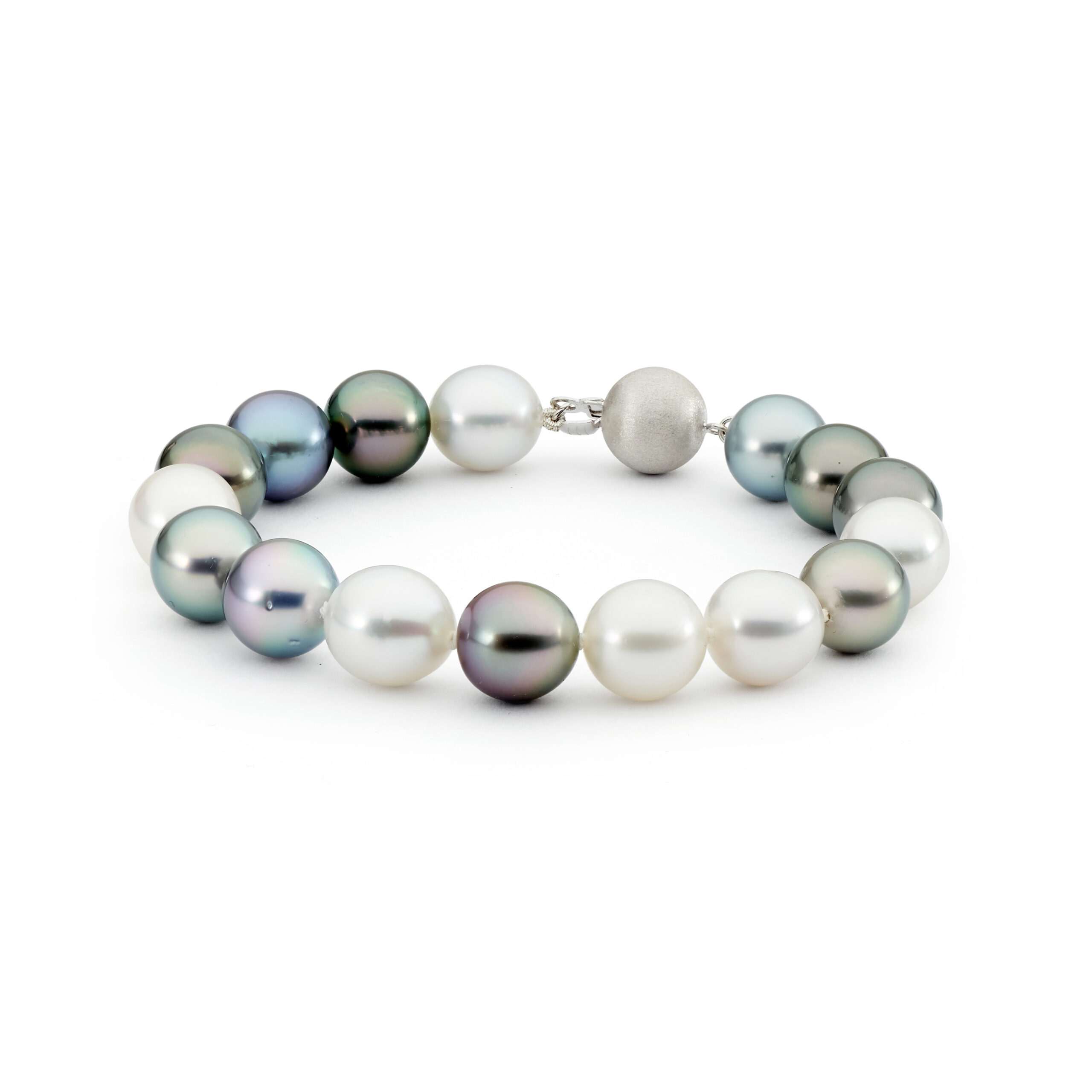 This Tahitian & white South Sea pearl strand bracelet features 16x oval/drop 10-11mm pearls.