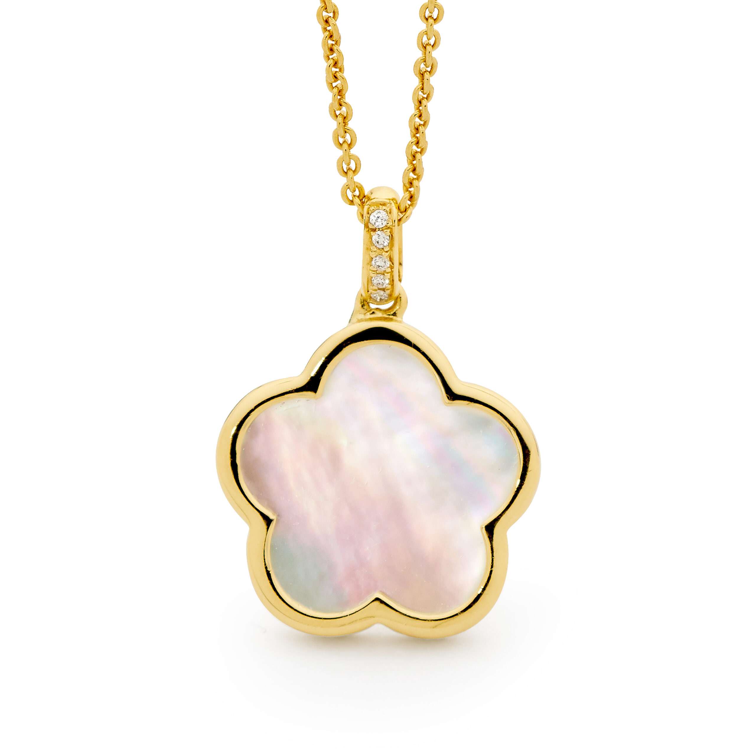 This beautiful Mother of Pearl & Diamond Flower Pendant is set in 18ct yellow gold and features hand cut white Mother of Pearl and 5=0.01ct G/VS diamonds set into the bale.