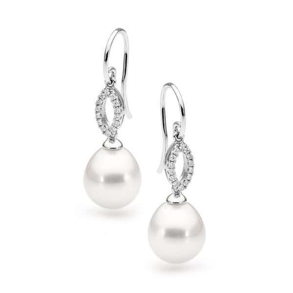 These classic fluted French hook earrings are set in 18ct yellow or white gold and feature a pair of lustrous 11-12mm oval/drop South Sea pearls.