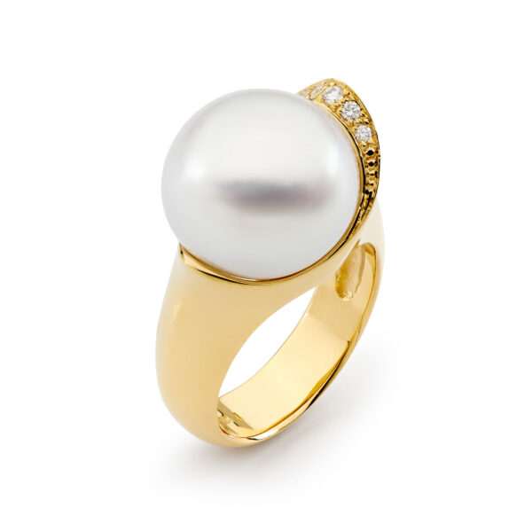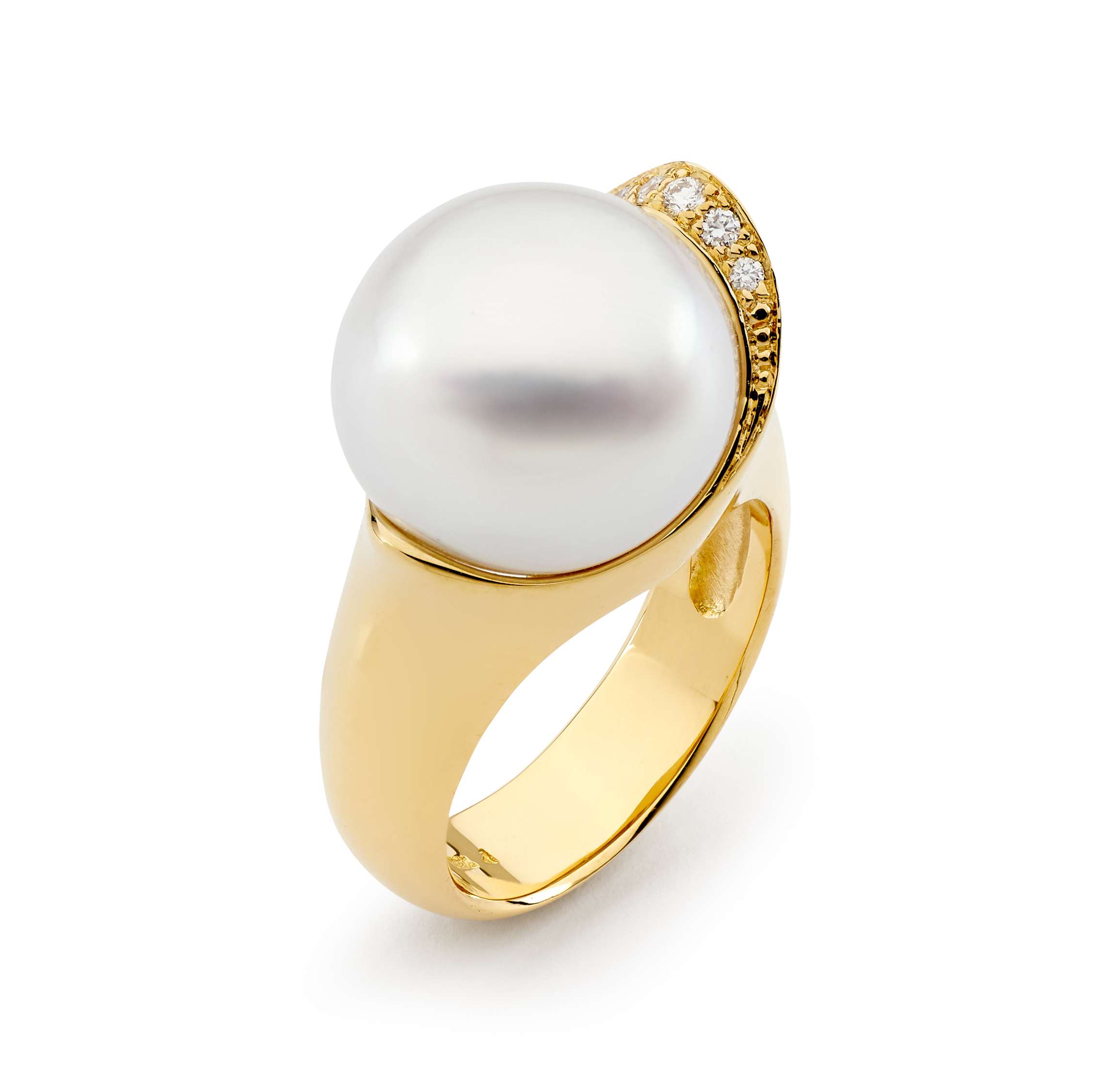 This beautiful polished pearl ring has been crafted in 18ct yellow gold, and features a lustrous 14.3mm near-round Australian South Sea cultured pearl and 5=0.075ct G/SI round brilliant cut diamonds.