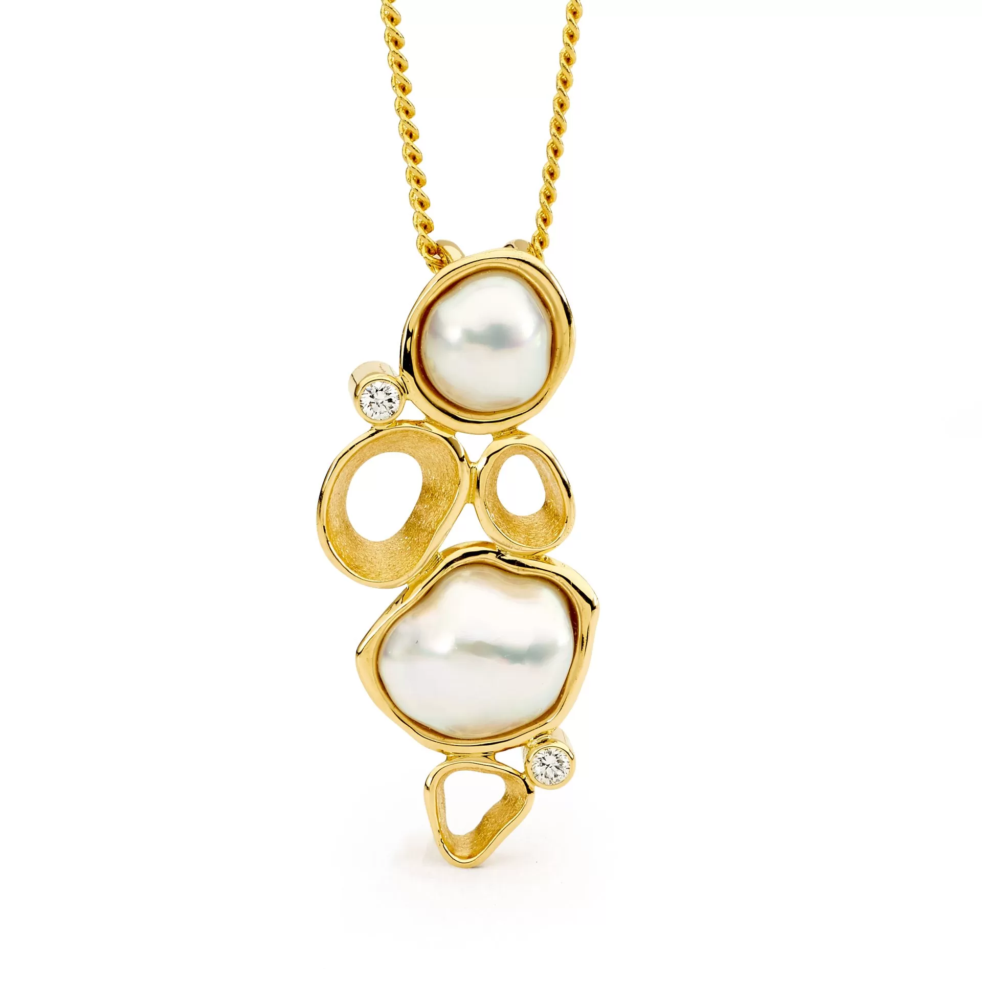 Handcrafted in 18ct yellow gold, the Rockpools Keshi Pendant features two 6-8mm Australian South Sea keshi pearls and 2=0.05ct G/SI round brilliant cut diamonds.