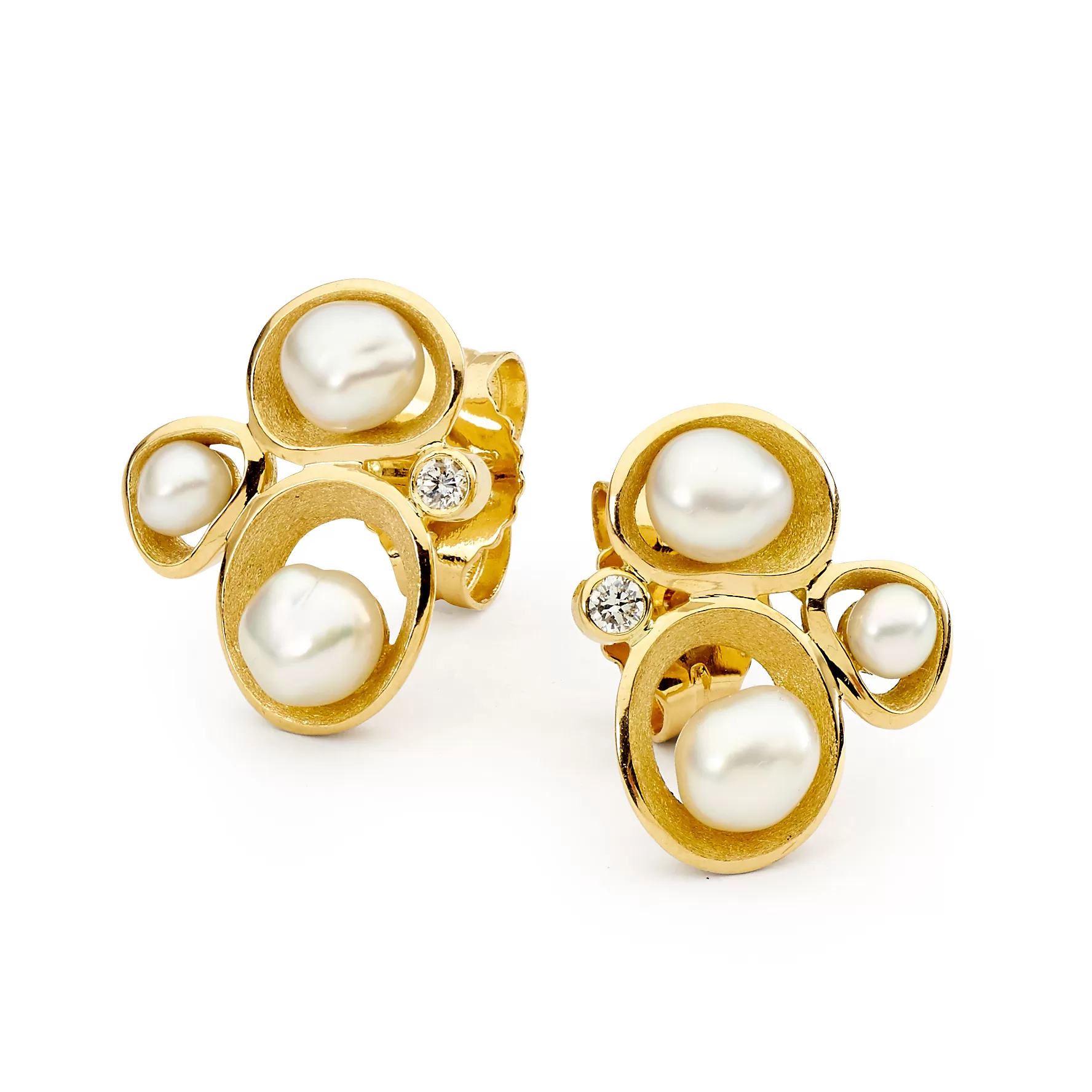 Handcrafted in 18ct yellow gold, the Rockpools Keshi Stud Earrings feature six 2-5mm Australian South Sea keshi pearls and 2=0.07ct G/SI round brilliant cut diamonds.