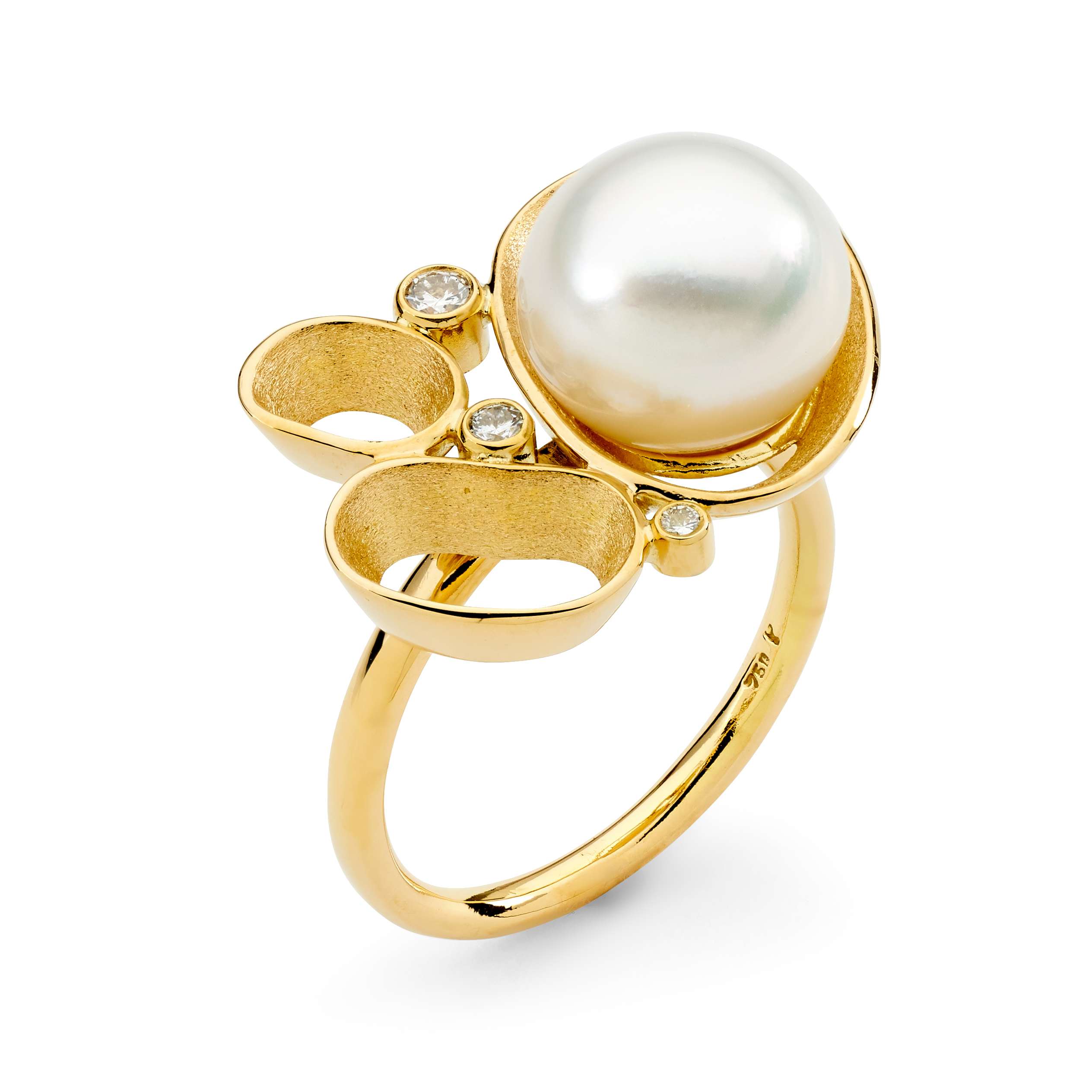 Handcrafted in 18ct yellow gold, the Rockpools Pearl Ring features a lustrous 10.4mm white South Sea cultured button pearl and includes 1x 0.015ct, 1x 1.03ct, and 1x 0.05ct G/SI round brilliant cut diamonds.