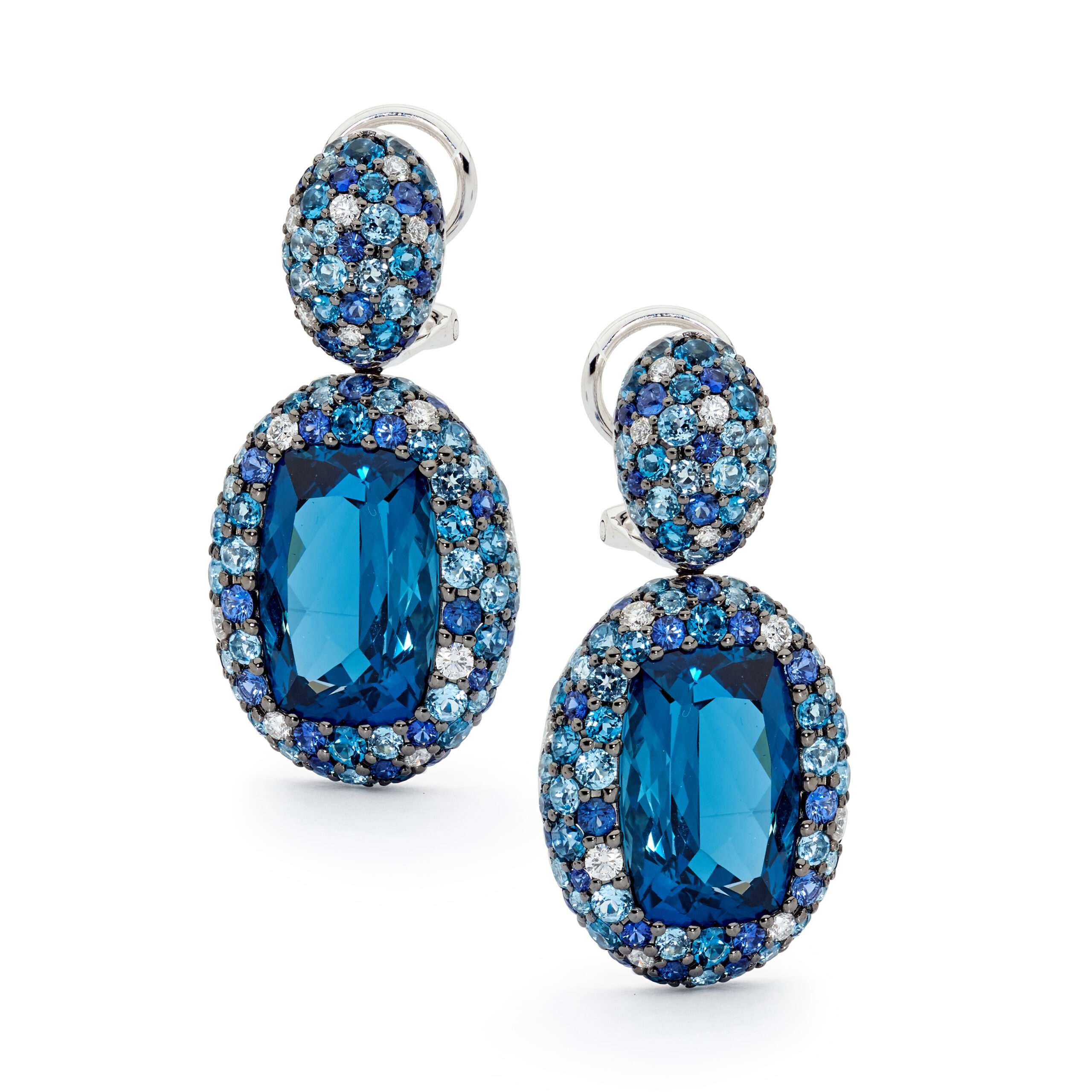 These breath-taking stud earrings are crafted in 18ct white gold and feature Blue Topaz (150=23.53cts), Blue Sapphires (76=2.34cts), and diamonds (26=0.62ct G/SI).