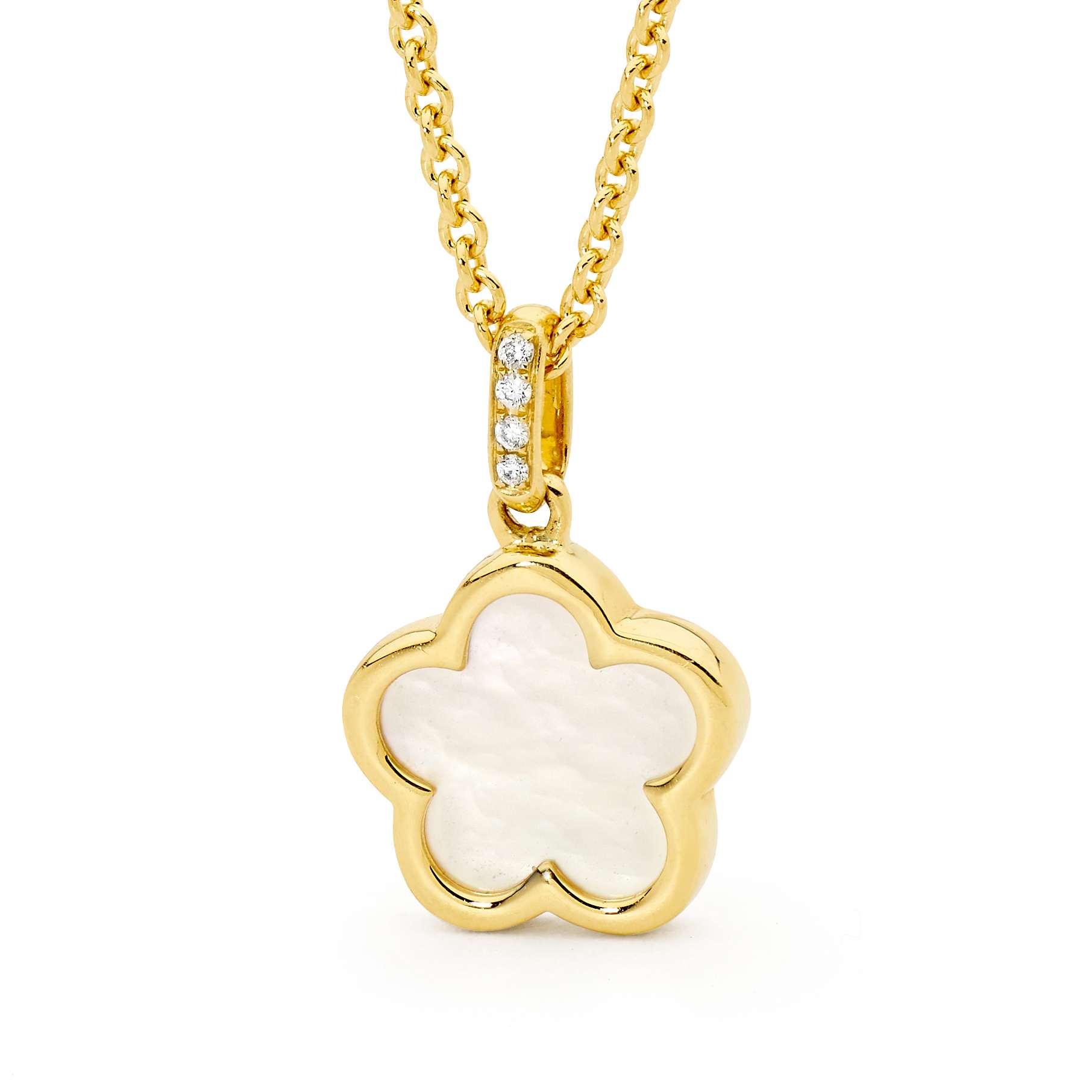 This beautiful Mother of Pearl Pendant (10mm) is crafted in 18ct yellow gold and features 4=0.01ct G/SI diamonds.