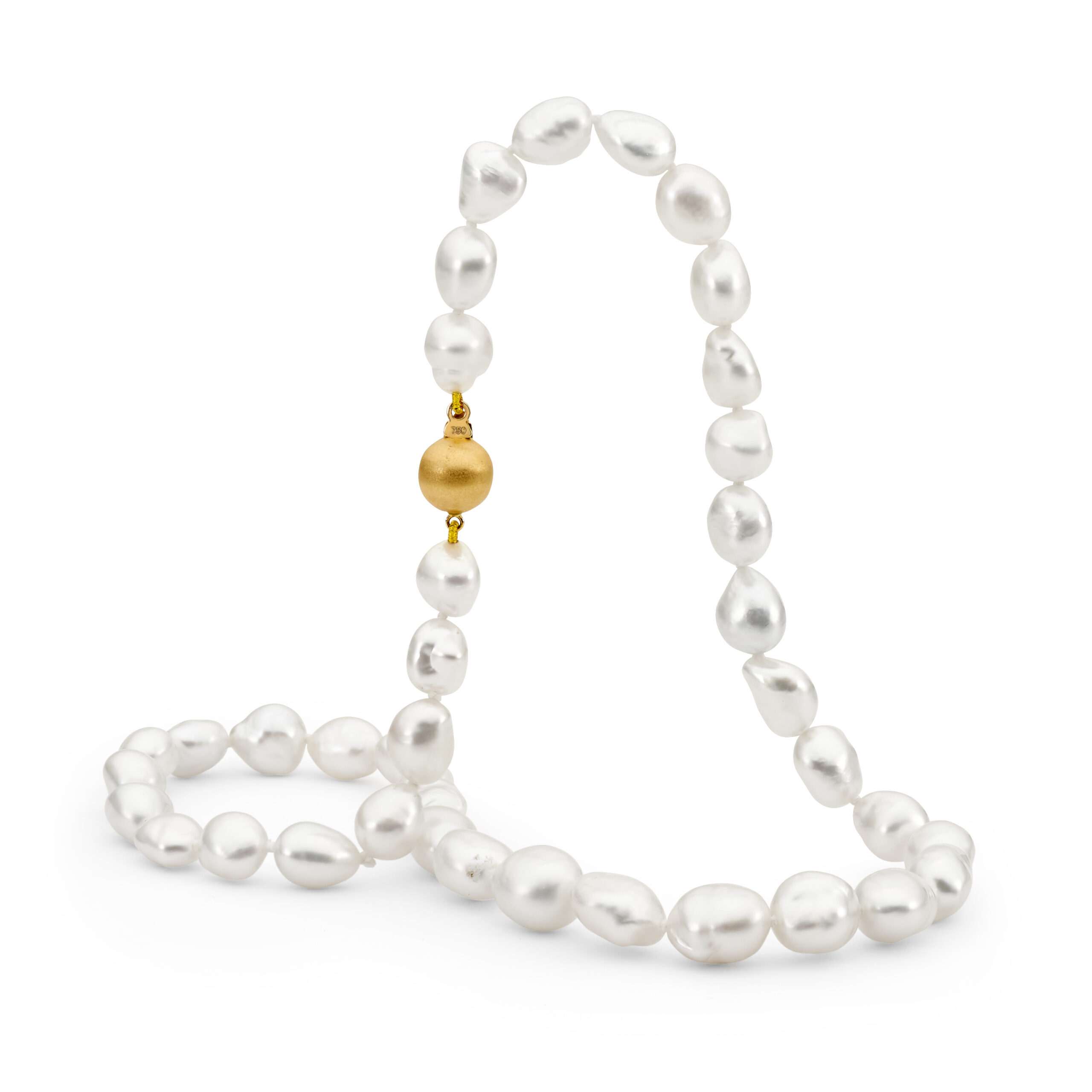 This beautiful strand features 39x Australian South Sea keshi pearls (8-10mm), and is complete with an 18ct yellow gold 9mm brushed ball clasp.