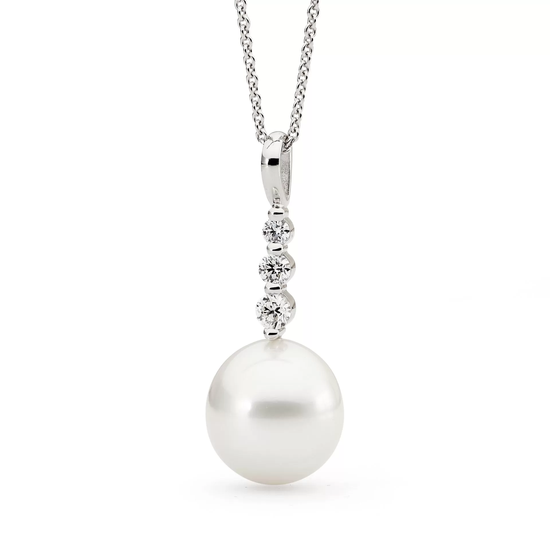 The Stars Aligned Pearl Pendant is handcrafted in 18ct white gold and features a 13-14mm oval/drop Australian South Sea cultured pearl and includes 3=0.37ct round brilliant cut diamonds.