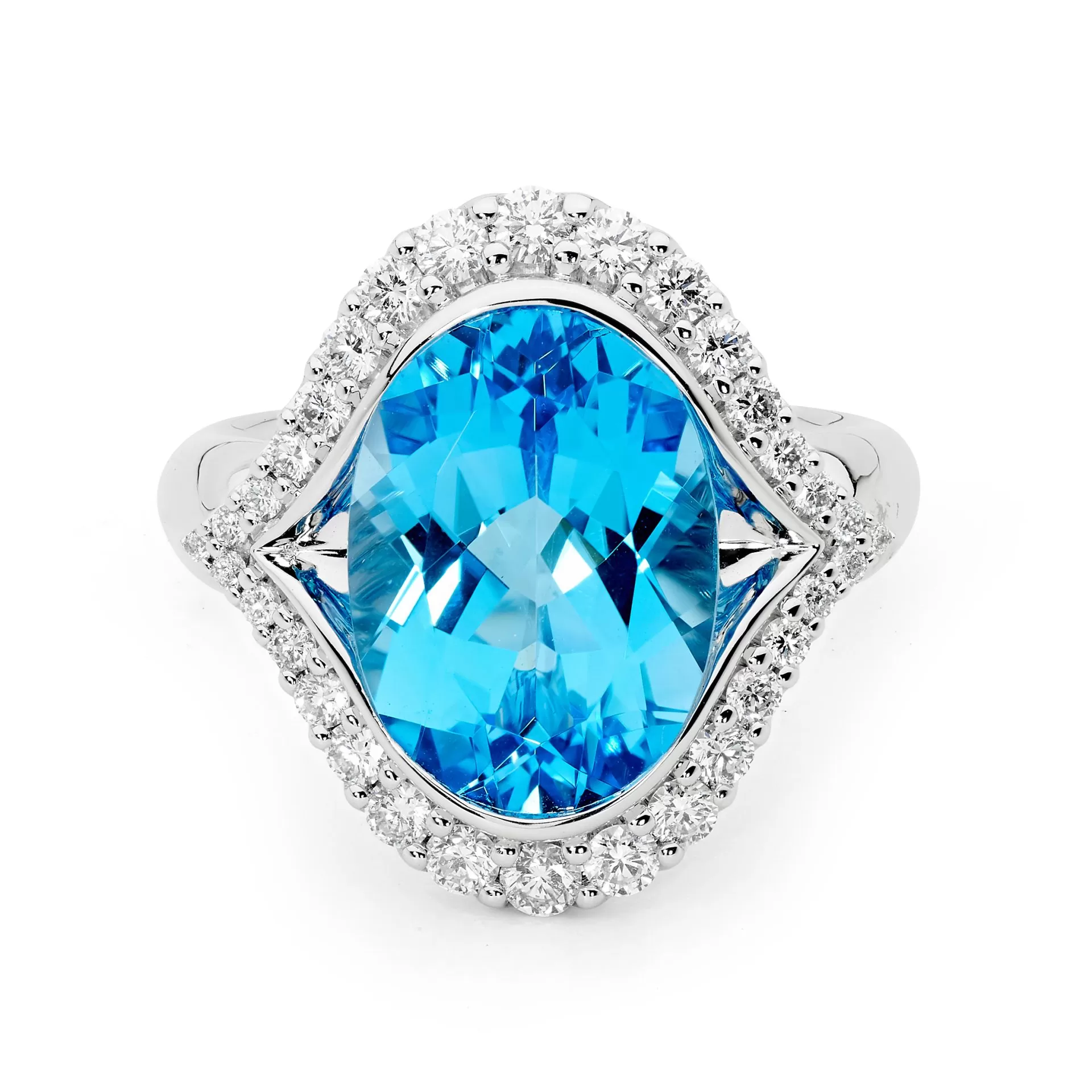 This stunning Swiss Blue Topaz & Diamond Ring is crafted in 18ct white gold and features 1 x 14x10mm oval cut Swiss Blue Topaz with a halo of 32 = 0.63 G/SI round brilliant cut