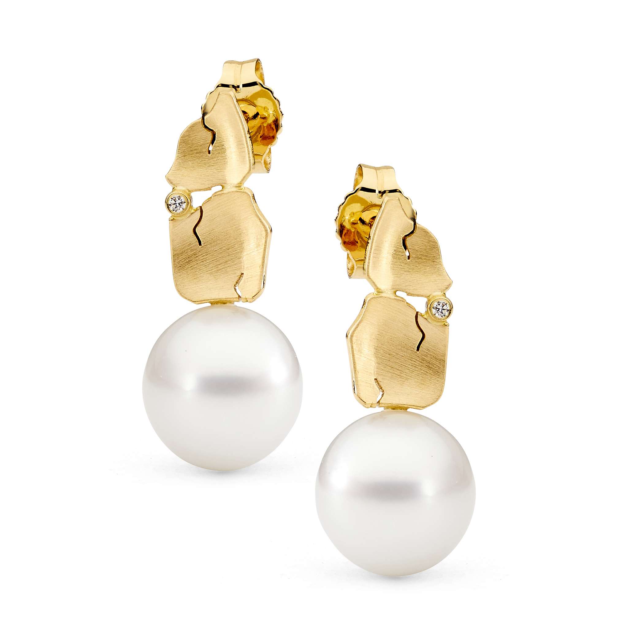 Handcrafted in 18ct yellow gold, these earrings feature a lustrous pair of 12×12.4mm oval/drop Australian South Sea cultured pearls and include 2=0.03ct G/SI round brilliant cut diamonds.