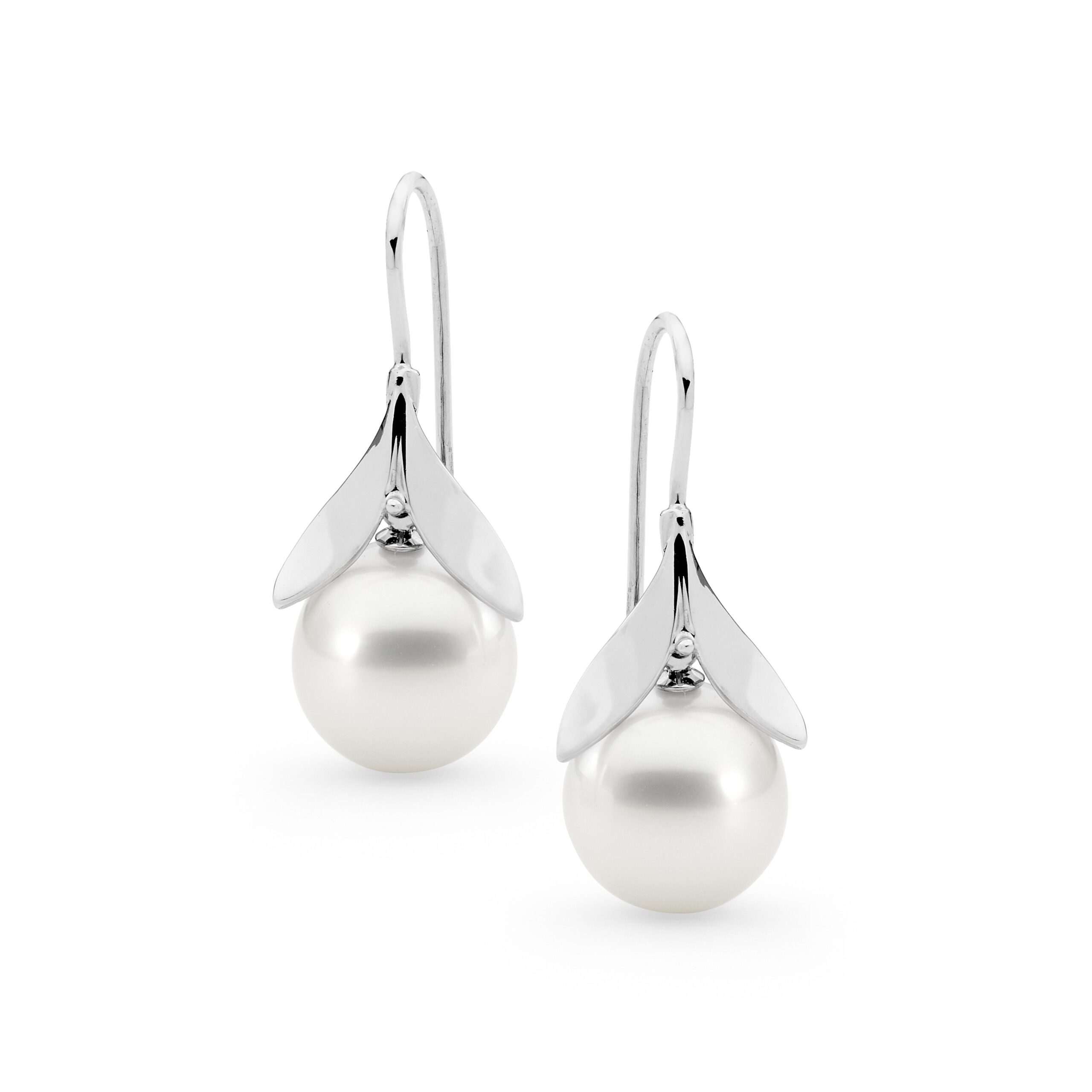Inspired by lush foliage of the Broome wet season, the ‘Tropical Summer’ earrings are crafted in 18ct white gold and feature a pair of luminous 11-12mm white oval/drop South Sea pearls.