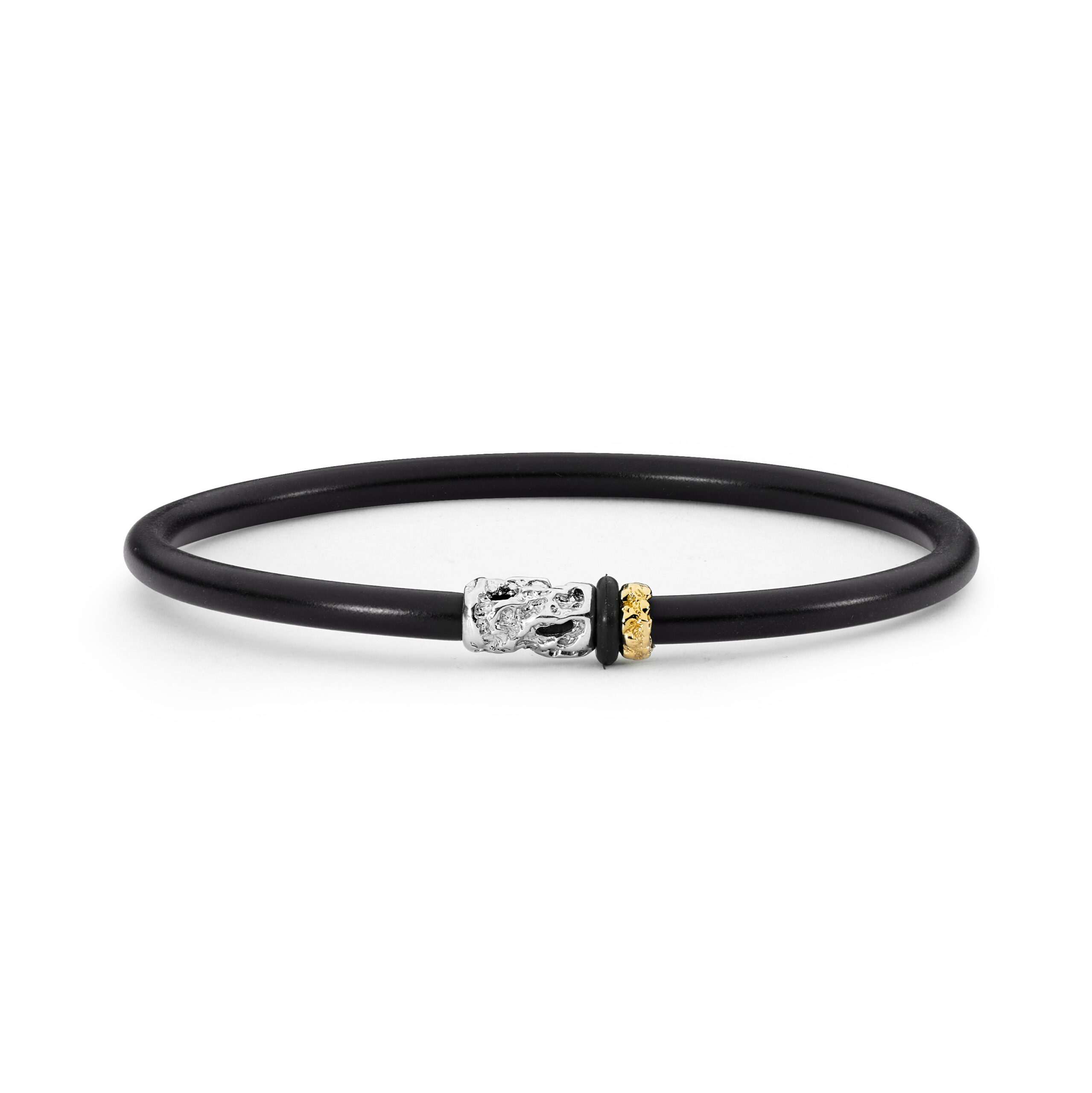 This 4mm neoprene bangle features a large bold organic-style sterling silver collar paired with a smaller 18ct yellow gold collar, separated by a neoprene ring for a clean, modern finish.